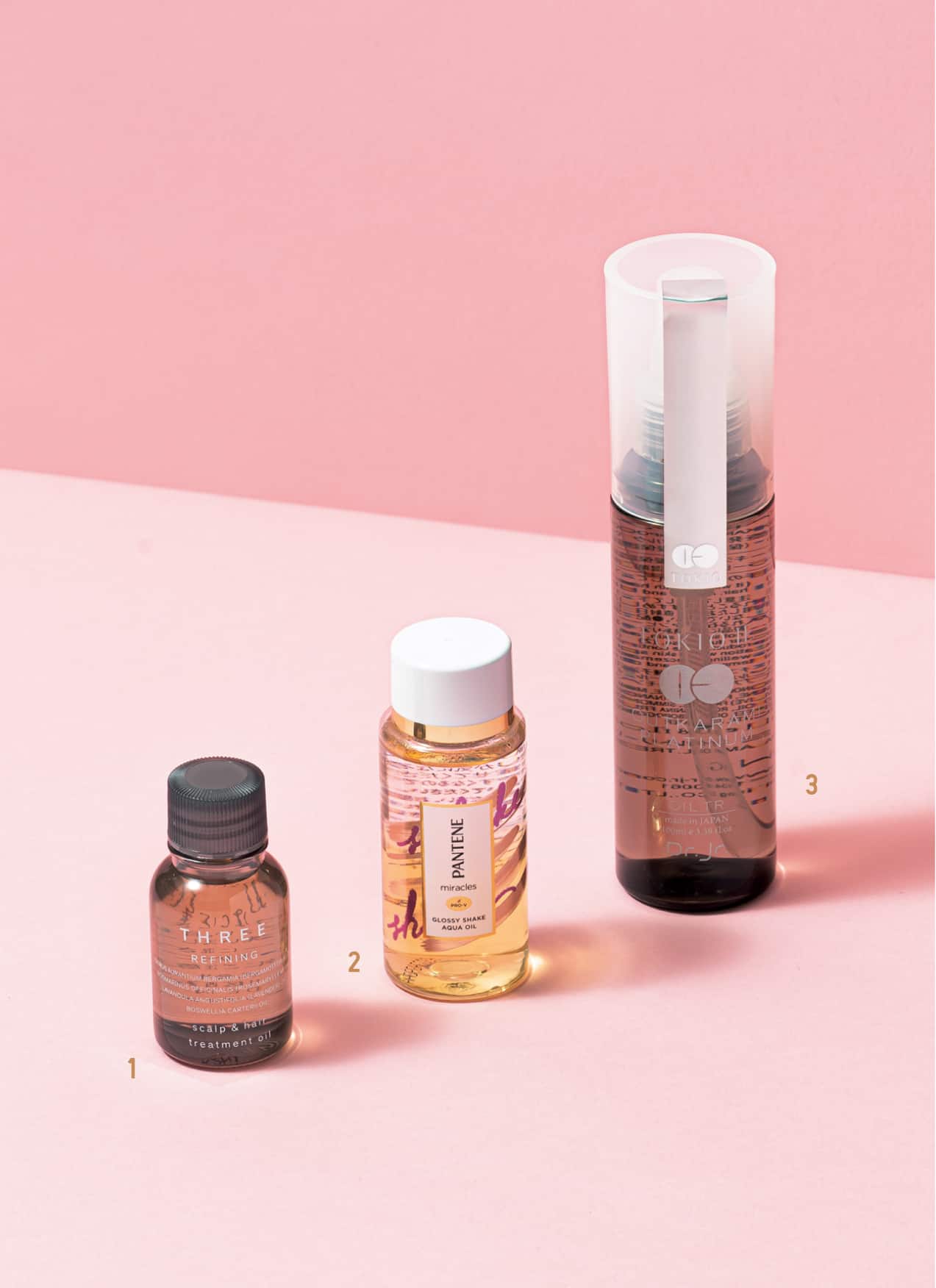 ドライヤーの熱から髪を守ったり、髪に不足している栄養分を補給できるアウトバストリートメントを日常使いすることで、ツヤのある髪に育ちます。❶キューティクルをなめらかに整えます。THREE スキャルプ&ヘア リファイニング トリートメント オイル R 20㎖¥3,000(THREE) ❷髪内部を補修する化粧水と、潤いを与えるオイルの2層タイプ。パンテーン ミラクルズ グロッシー シェイクアクアオイル49㎖オープン価格(P&G) ❸保湿成分が軽やかな指通りに仕上げます。TOKIO IE OUTKARAMI PLATINUM OIL.TREATMENT 100㎖¥3,200(イフイング)