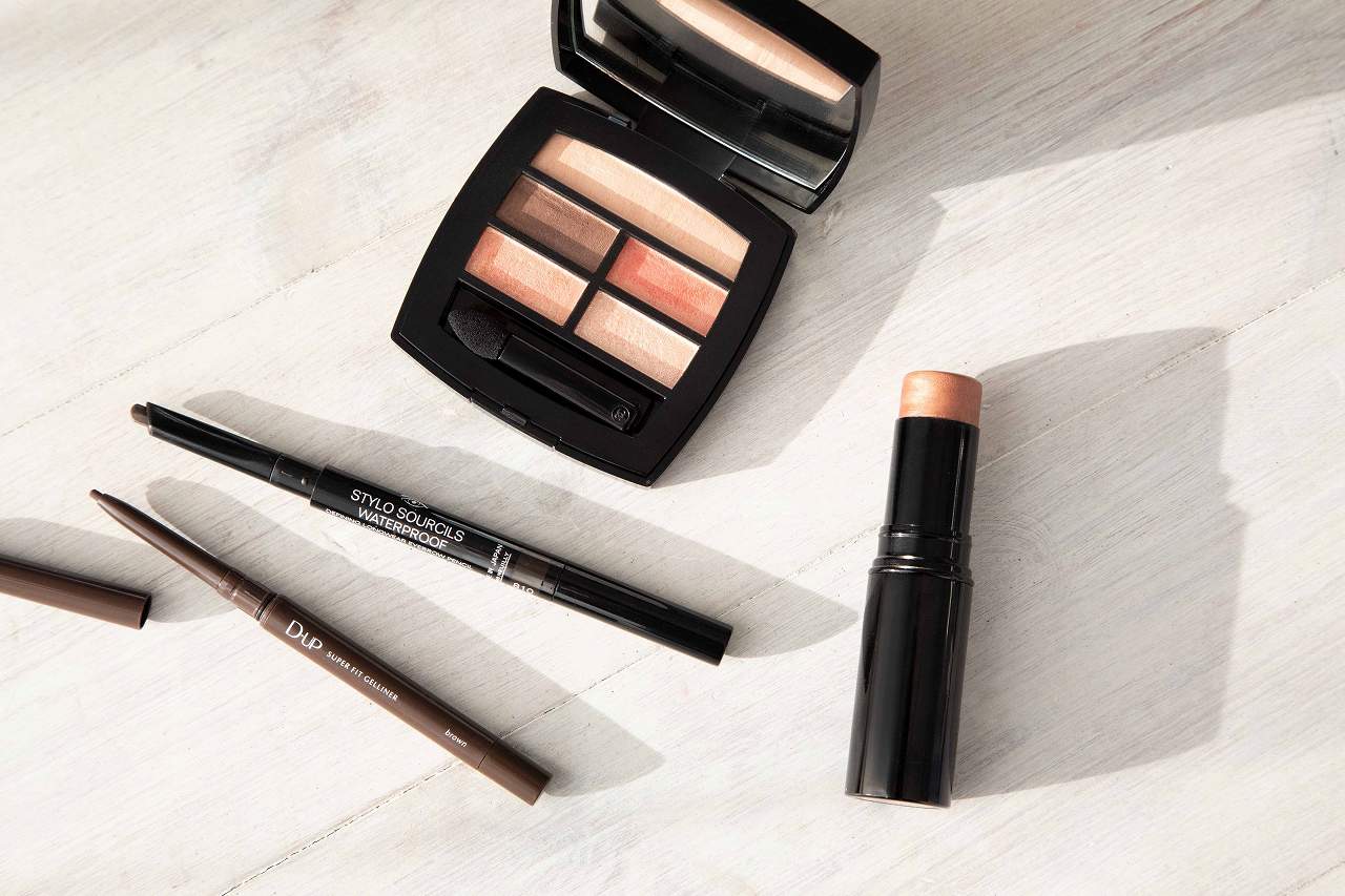 <右から>シャネル ボーム エサンシエル ゴールデン ライト、シャネル レ ベージュ パレット ルガール ウォーム(中間右色を使用)、シャネル スティロ スルスィル ウォータープルーフ810(以上すべて川村さん私物)D-UPスーパーフィット ジェルライナー ピーチブラウン(加治さん私物)