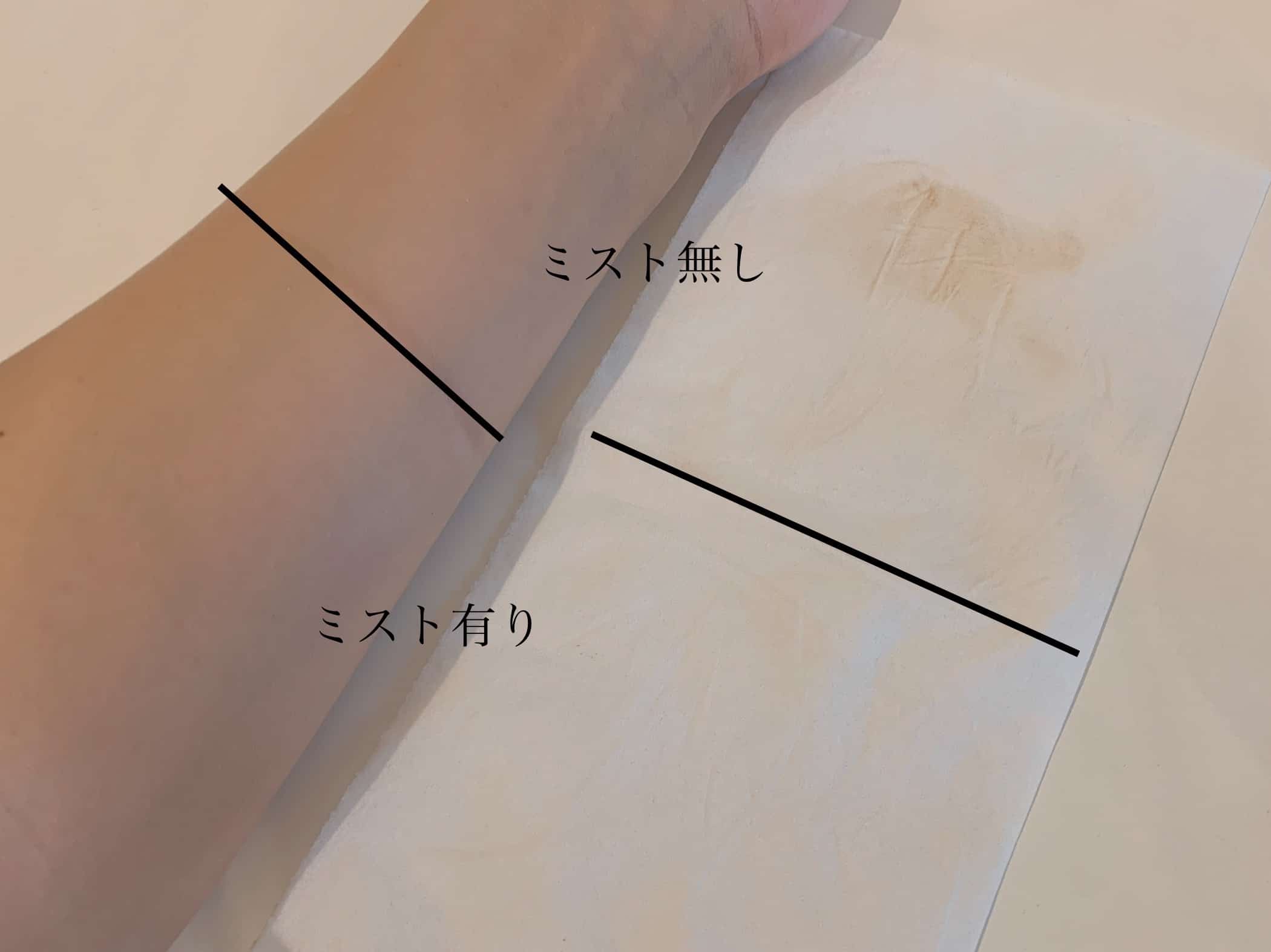 ファンデーションを塗り、下半分はミストを重ねて使用しました。ミスト無し(上)の箇所はと比べて、ミスト有り(下)の箇所はファンデーションの付着が軽減しているのがわかります。