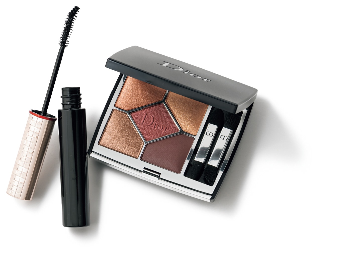 [右から]ツヤ感のあるオレンジと締め色のブラウンがセットに。サンク クルール クチュール 689¥7,600〈8月7日発売〉(パルファン・クリスチャン・ディオール) まつげにしっかりと液がつく黒のマスカラ。マキアージュ ビューティシルエットマスカラBK999¥2,800〈編集部調べ〉(マキアージュ)