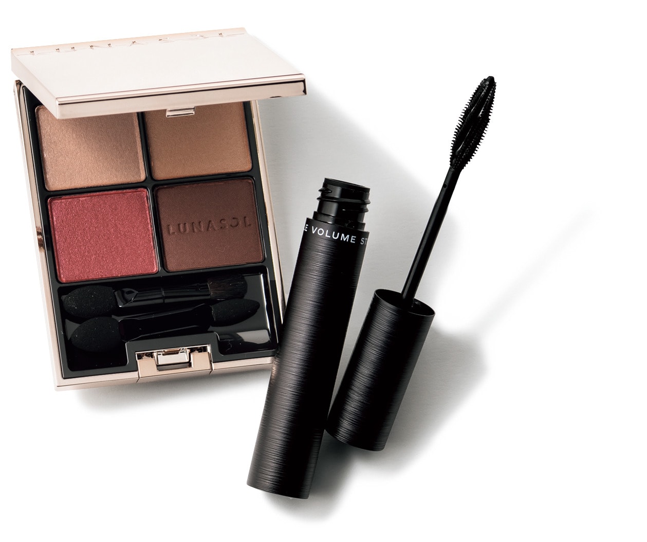 [右から]目を見張る長さをまつげにプラスしてくれるマスカラ。ル ヴォリューム ストレッチ¥4,500(シャネル カスタマーケア)、赤みのあるピンクが、画像を通してもフレッシュな目元に仕上げてくれる。ルナソル アイカラーレーション09¥6,200〈8月7日発売〉(カネボウ化粧品)