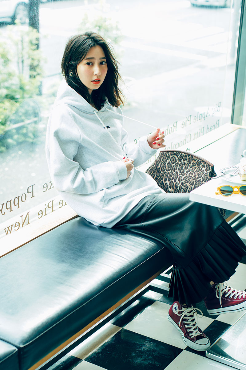 オーバーサイズの肉厚フーディには、正面には〝THIRD〟後ろに〝MAGAZINE〟の刺繍が!辛口なレザースカートで引き締めて。フーディ¥25,000スカート¥58,000(ともにTHIRD MAGAZINE)バッグ¥53,000(ア ヴァケーション/シップス 有楽町店)スニーカー¥5,800(コンバース/コンバースインフォメーションセンター)サングラス¥30,000(アイヴァン/アイヴァン PR)イヤリング¥2,864リング¥9,500(ともにアビステ)
