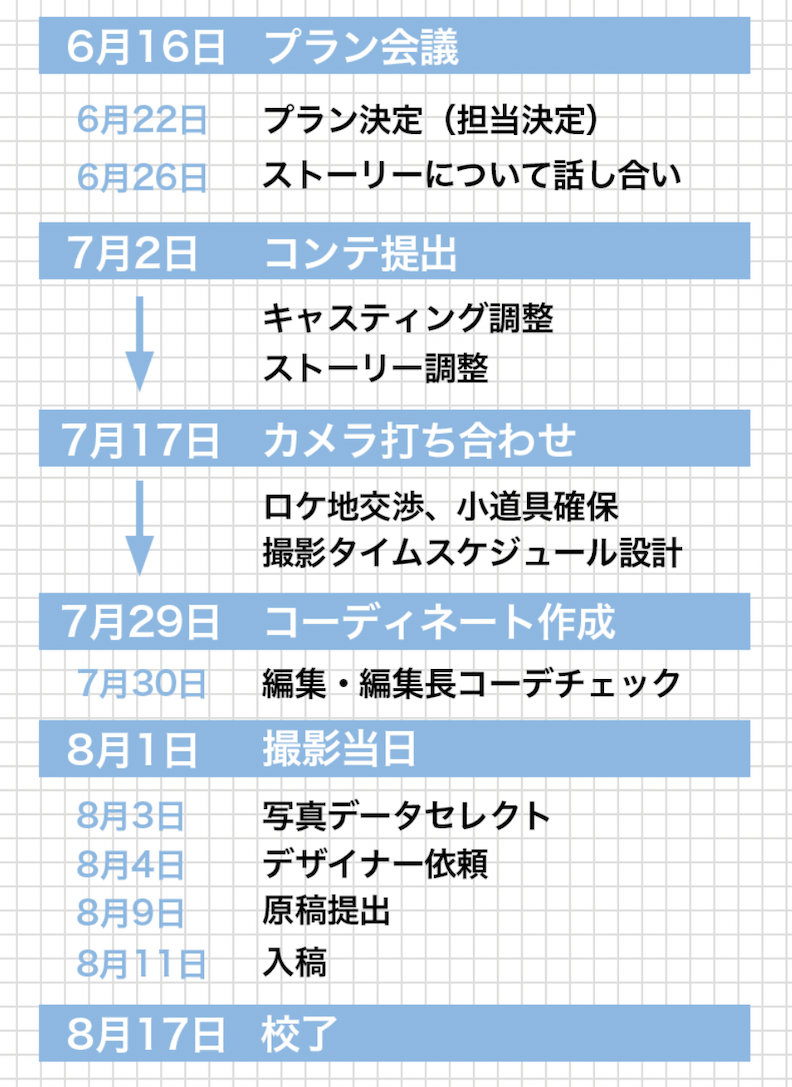 編集・月田(以下、月):そう、まずはそこがスタート。そこから、編集&ライターで話し合ってストーリーの大枠を決めていきます。どんなシチュエーションでどんな画を撮りたいか、モデルは誰がいいか、などを肉付けしていくイメージ。それが決まったら、編集がコンテを描きます。