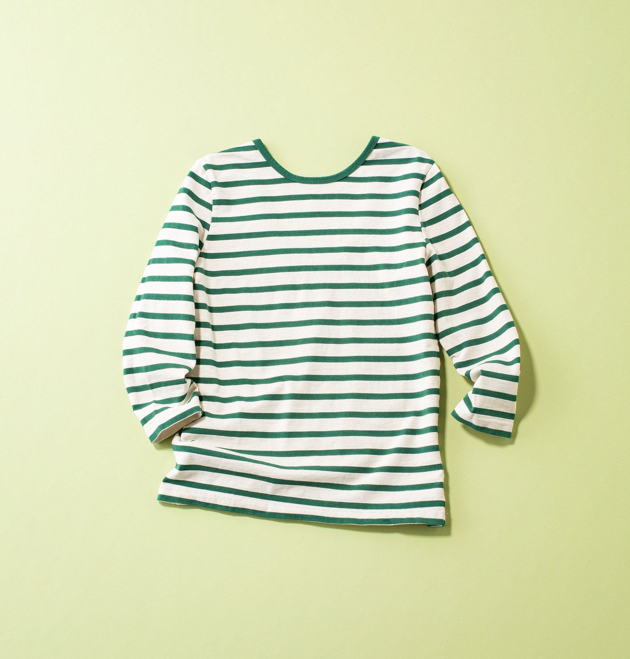 少年見えすぎたり、ご近所服見えすぎてしまったりと、手抜きに見えるのが気になるボーダー。でも、これは背中がかなり大きくあいていてフェミニンに着られるのが魅力なんです。