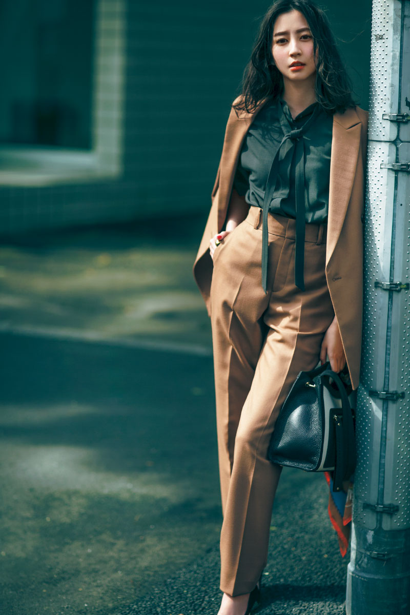 春夏のデビューシーズンでも大人気だった、アンクレイヴのアイコン的存在のセットアップ。しなやかなウール素材で着たときのシルエットの美しさにうっとり!インナーを替えて休日にも。ジャケット¥24,000ブラウス¥14,000パンツ¥16,000(すべてアンクレイヴ)バッグ¥69,000(プリニオヴィソナ/アオイ)パンプス¥52,000(ペリーコ/アマン)スカーフ¥16,000(マニプリ/フラッパーズ)リング¥7,280(ソコ/ZUTTOHOLIC)