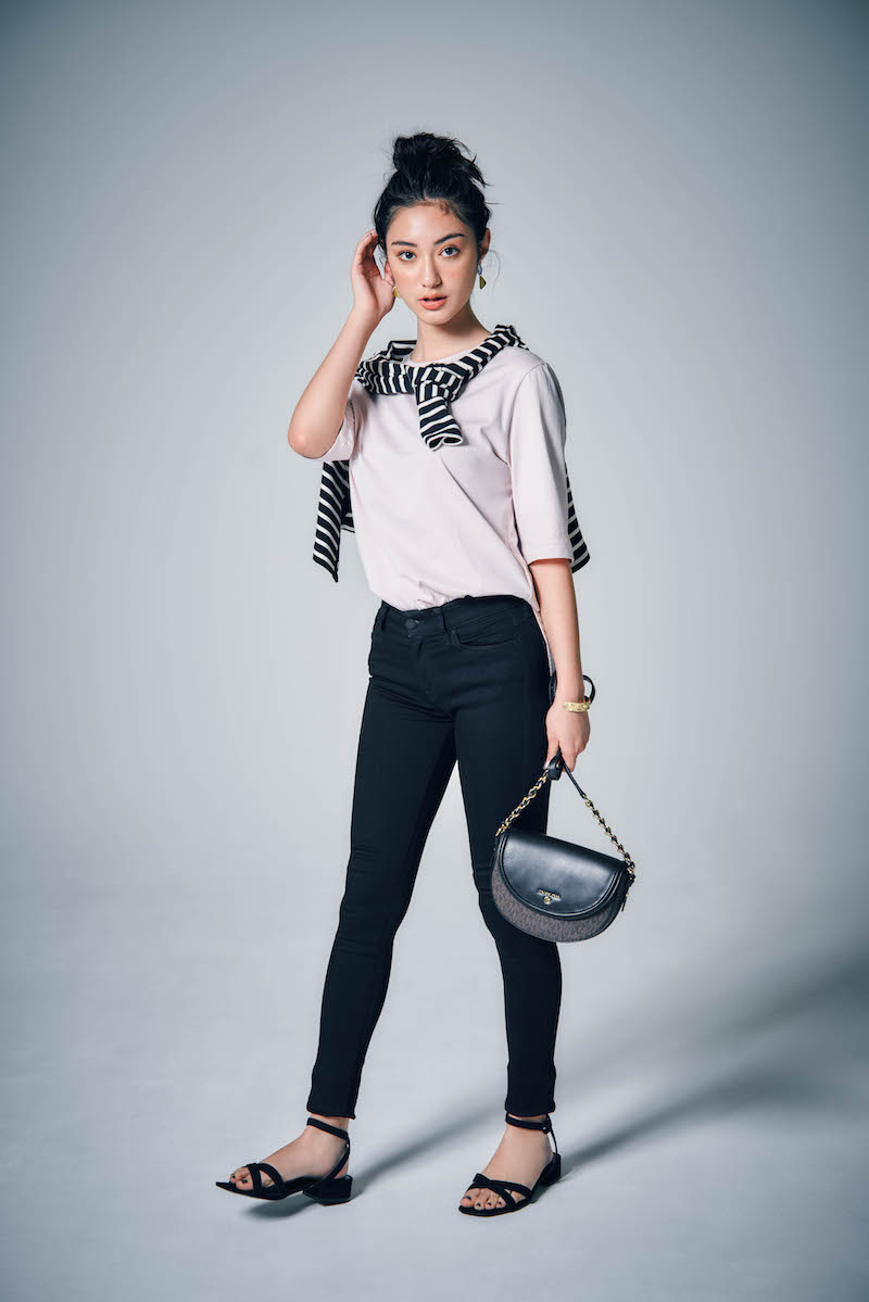 オーバーサイズTシャツ¥14,000(エイトン/エイトン青山)黒スキニー¥21,000(ディーゼル/ディーゼル ジャパン)ボーダーカーディガン¥16,000(ルミノア/ゲストリスト)バッグ※10月展開予定¥37,000(マイケル マイケル・コース/マイケル・コース カスタマーサービス)サンダル¥3,990(MANGO/LOCONDO)イヤリング¥8,000<マージョリー・ベア>バングル¥21,000<ドンナ>(ともにココシュニック オンキッチュ 有楽町マルイ店)