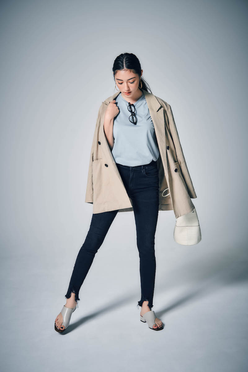 ジャケット×スキニーの王道コーデは、くすみブルーのノースリTでほどよい抜け感を。カットオフのアンクル丈スキニーには、トングサンダルを合わせてヌーディかつ脚長に。サンダルやバッグなど、彩度の低い小物をうまく使えばより洗練されたムードが漂います。