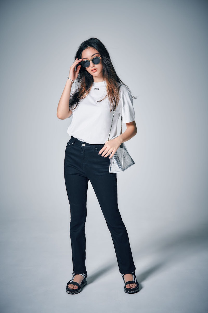 ミニロゴTシャツ¥9,500(THIRD MAGAZINE/サードマガジン) 黒スキニー¥7,700(Mila Owen) バッグ¥16,500(HASHIBAMI/コレクト)サンダル¥14,000(バナナ・リパブリック)サングラス¥16,800(KOMONO/KOMONO TOKYO)フープピアス¥19,000バングル¥16,000(ともにJouete)
