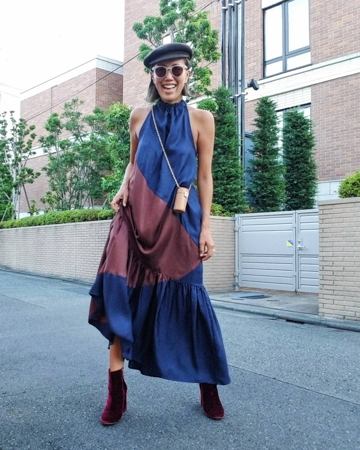 「まだまだ暑い今、ノースリワンピも色使いと小物を工夫すれば秋っぽく着られます。色はブラウンやボルドー、小物はウール素材の帽子とベロア素材のショートブーツを合わせました」