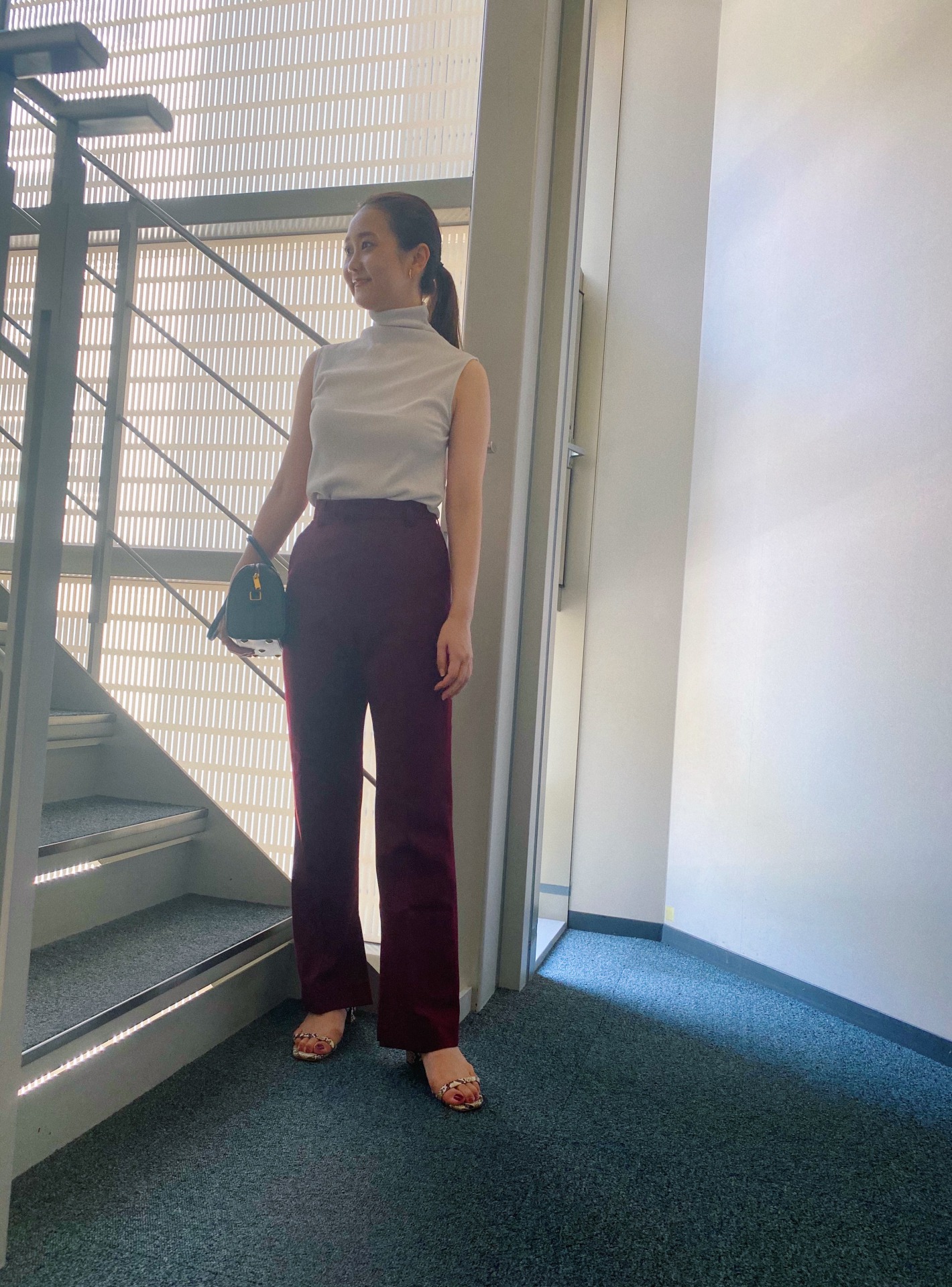 「ハイネックで秋の雰囲気をプラス。実はこのトップス、さらっとしたドライタッチですごく快適なんです! シンプルなワンツーコーデなので、深みのあるボルドーやパイソン柄をアクセントにしました」