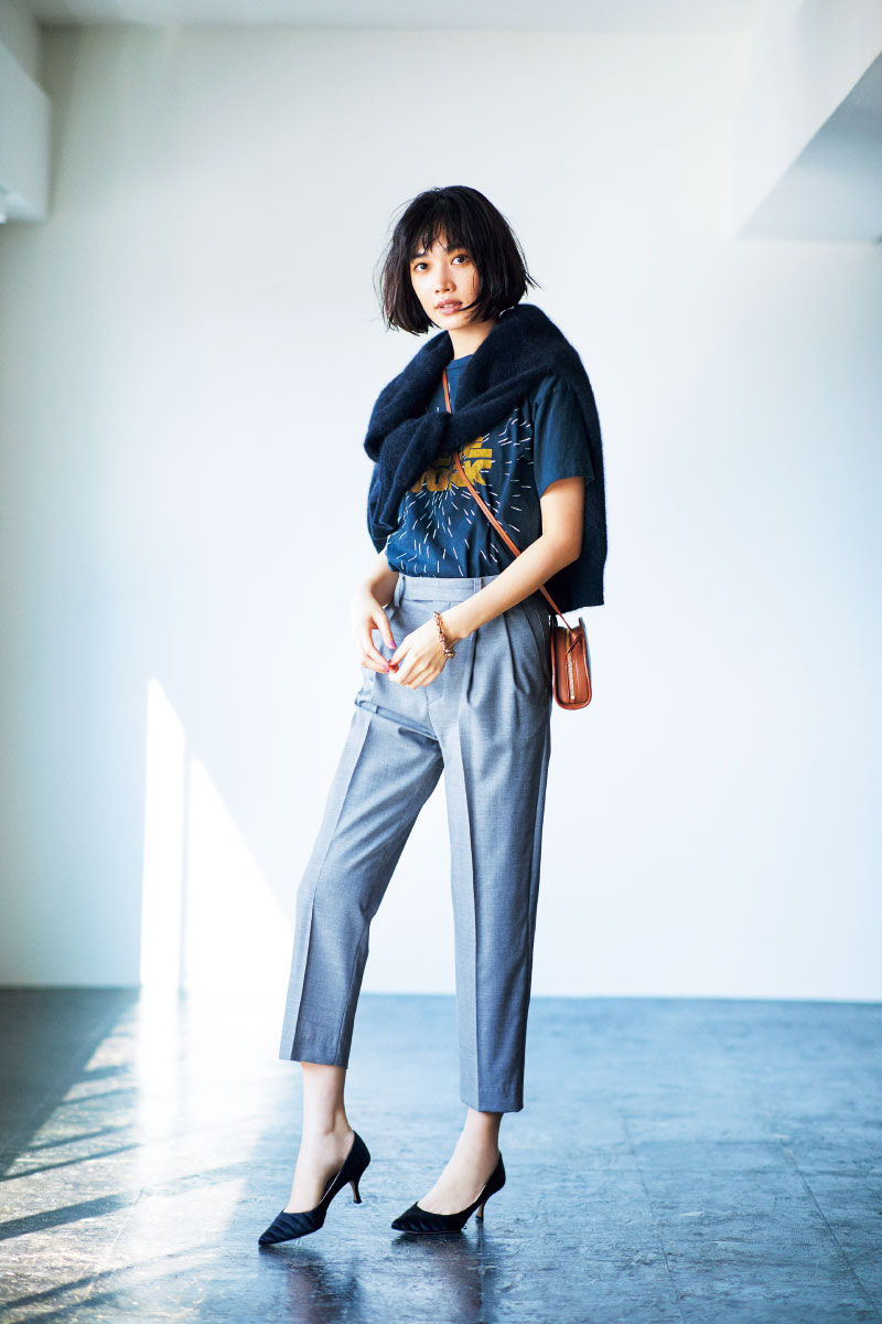腰周りのタックとテーパードシルエットが、悩み多き下半身に自信をもたせてくれるこだわりの一本。バランスの取りやすいやや短めレングスで、着こなしの主役にも脇役にもなる、秀逸なフォルム。シーズンレスで着られるサラリとしたウールは、カジュアルにもキレイめにもなじんでくれます。パンツ¥21,000(スタニングルアー/スタニングルアー青山店)Tシャツ¥7,800(レミ レリーフ/ユナイト ナイン)肩にかけたニット[10月以降の展開予定]¥59,000(サクラ/インターリブ)バッグ¥49,000(ペリーコ/アマン)パンプス¥46,000(ネブローニ/フラッパーズ)ブレスレット¥6,682(アビステ)
