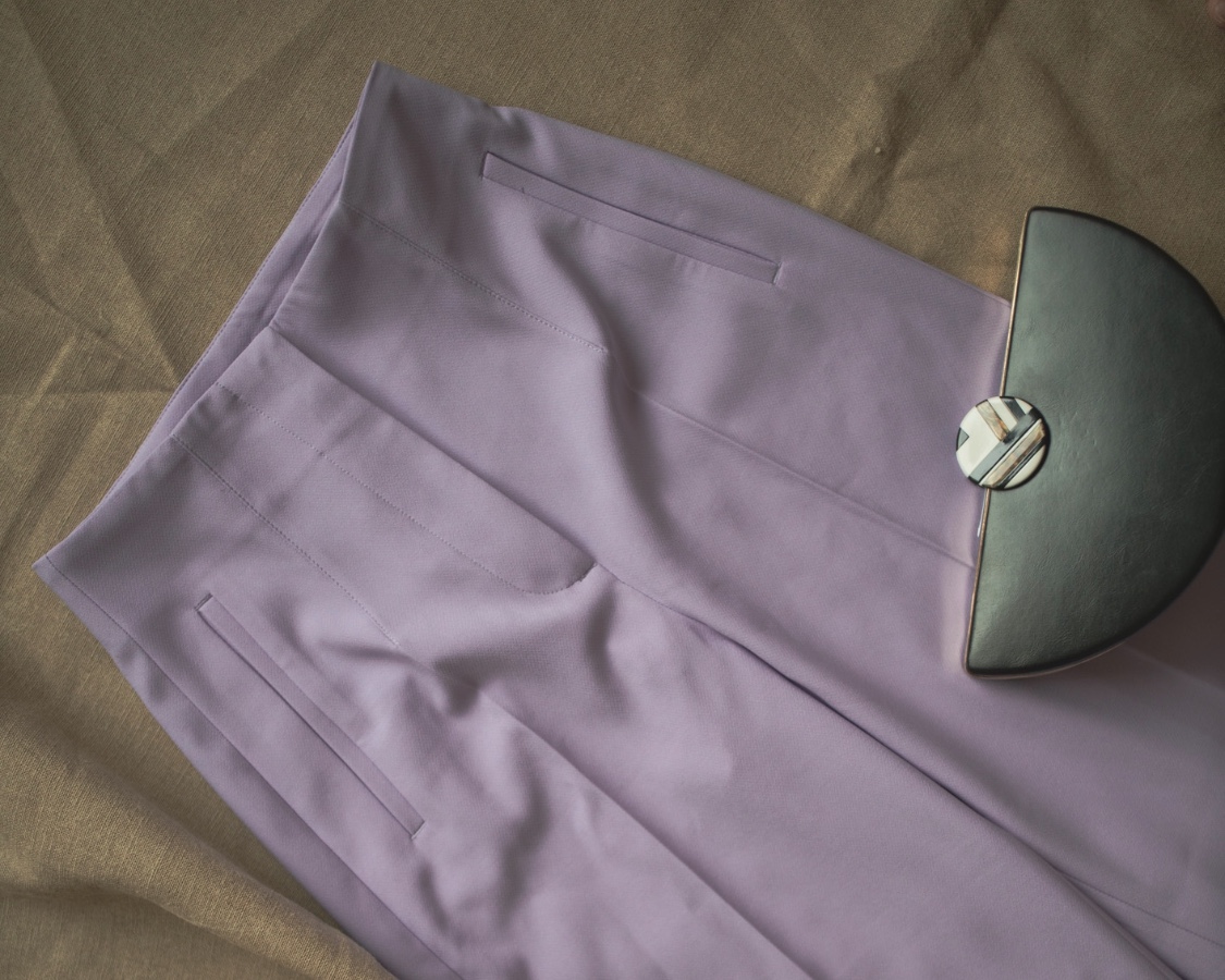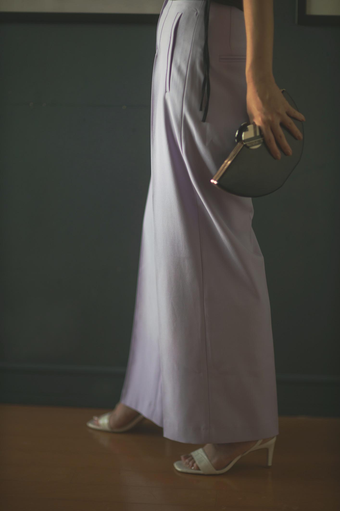 お腹まわりはこんなふうにスッキリしていて、余計なものが付いていないところも良き。スッキリ見えます。ブルべで寒色系のカラーのほうが似合う(気がする)ので、このラベンダーの色味も完璧でした。今季もラベンダーは多いし、なんとなく秋っぽいムードも。もう少し涼しくなったらシアーな透ける黒ニットを、冬になったらふわふわのアイスグレーのニットを合わせたいなと妄想中です。