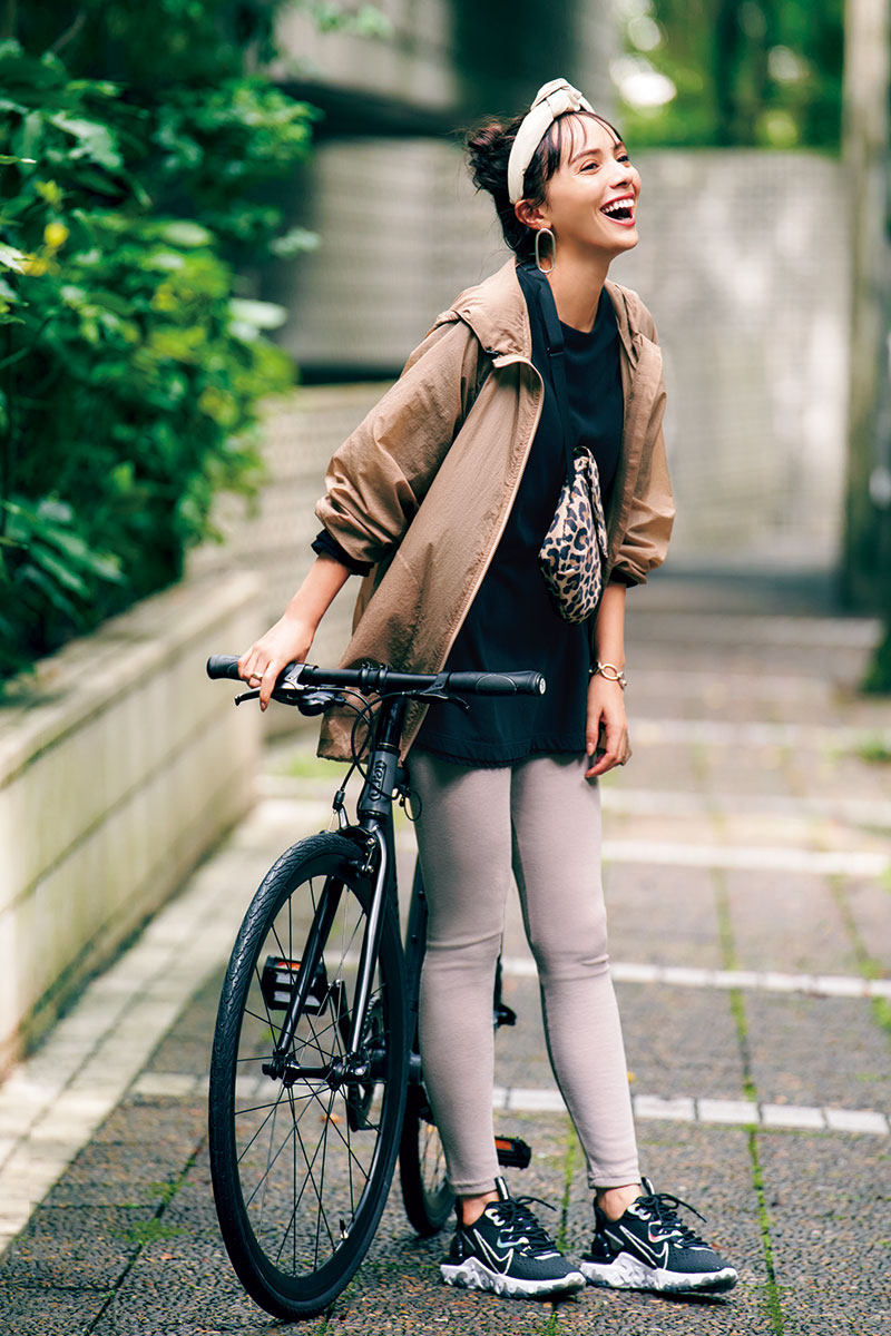 ベージュの柔らかい色みを黒で引き締めてカッコよく。リブレギンスだと、可動域も広がり動きやすい!スポーティでリラクシーな今どきのアスレジャースタイルが完成です。自転車¥53,000(tern/リピト・イシュタール)ジャケット¥26,000(ミューニック/ピーチ)ロングTシャツ¥24,000(エイトン/エイトン青山)レギンス¥4,800(ルーニィ)バッグ¥24,000(マッキントッシュ×ポーター/マッキントッシュ青山店)スニーカー¥13,000(ナイキスポーツウェア/NIKEカスタマーサービス)カチューシャ¥11,000(マルツォリーネ/エイチビューティ&ユース)ピアス¥11,000(ニナ・エ・ジュール/フリークス ストア)リング¥13,000(ニナ・エ・ジュール/ショールーム233)バングル¥129,000(チェリーブラウン)