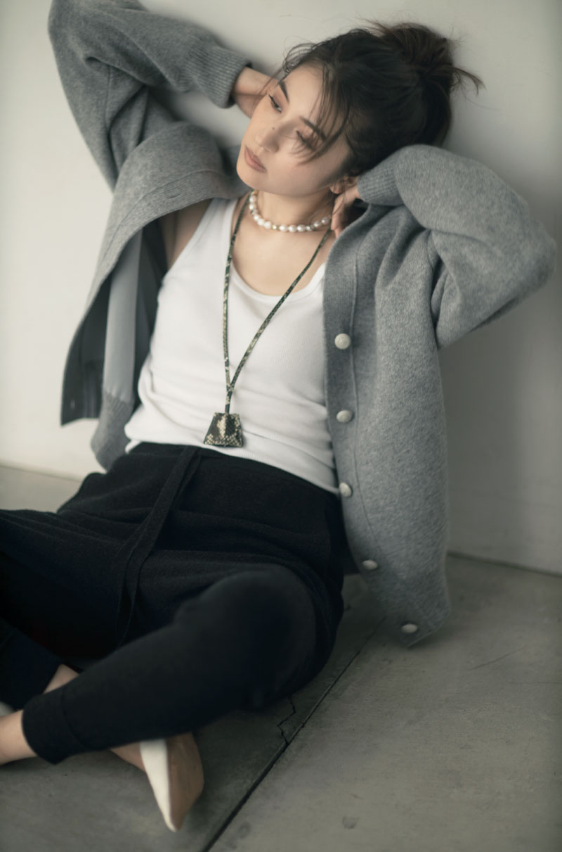 一張羅カーデこそ30代に必要なもの素材だけでなく、ボタンや裏地などディテールにこだわって選ぶことが重要。本当にいいものなら、10年は着られる。カーディガン¥89,000 ニットパンツ¥43,000(ともにドゥロワー/ドゥロワー六本木店)タンクトップ¥7,000(スリードッツ/スリードッツ青山店)ネックレス¥16,000(J&Mデヴィッドソン/J&Mデヴィッドソン 青山店)シューズ¥58,000(ブロック コレクション/ロンハーマン)パールネックレス¥128,000(プリーク/エイチビューティ&ユース)