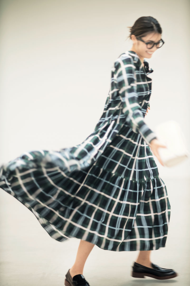 羽織りや足元問題を気にすることなく、単体でコーデが出来上がる長袖マキシワンピ。ドラマチックなシルエットを選べばチェック柄も甘すぎず、大人見え。ワンピース¥109,000(クリスチャン ワイナンツ×デミルクス ビームス/ビームス ハウス丸の内)バッグ¥160,000ローファー¥99,000〈ともに9月発売予定〉(ともにトッズ/トッズ・ジャパン)めがね¥31,000(モスコット/モスコット トウキョウ)