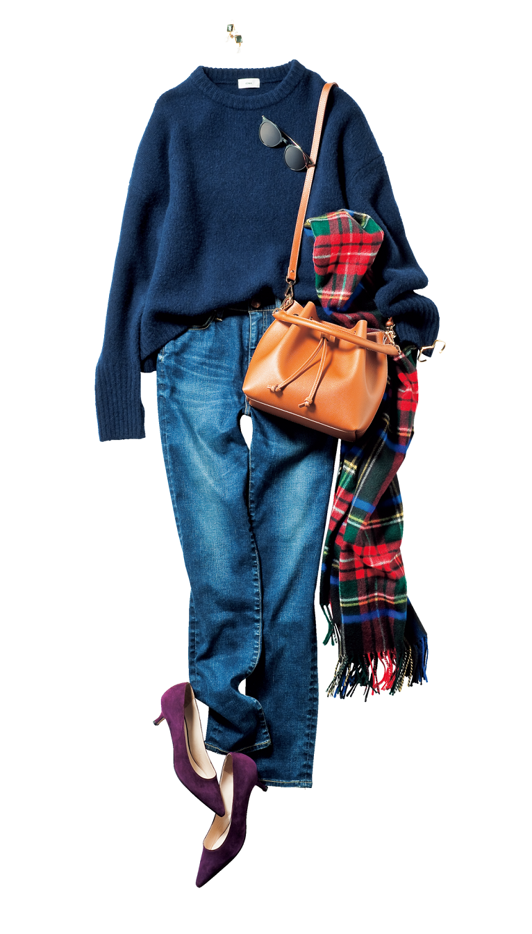 ニット¥29,000(ティッカ/ビームスハウス 丸の内)パンツ¥22,000(ヤヌーク/カイタックインターナショナル)コート¥44,000(ハリス/ハリス代官山店)バッグ¥30,000(ケイト・スペード ニューヨーク/ケイト・スペード ジャパン)スカーフ¥7,800(マニプリ/フラッパーズ)靴¥13,500(ダイアナ/ダイアナ 銀座本店)