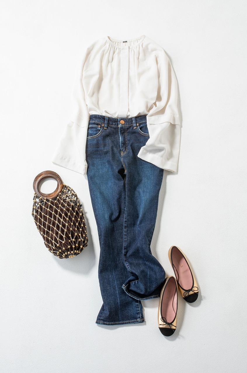 「とにかく柔らかくて穿きやすい!」とファンの多いレッドカード。本当にデニム?と思うほどソフトな着用感ながら、気になる下半身のボリュームをしっかりとカバー。ボリューミィな白ブラウスをインすることで、ウエストのほっそり見えも叶います。デニムパンツ¥19,000(レッドカード/ゲストリスト)ブラウス¥8,400(Mila Owen/Mila Owen ルミネ新宿2店)ウッドビーズバッグ¥19,000(マルシェ/フラッパーズ)ゴールドバレエシューズ¥26,000(プリティ・バレリーナ/F.E.N.)