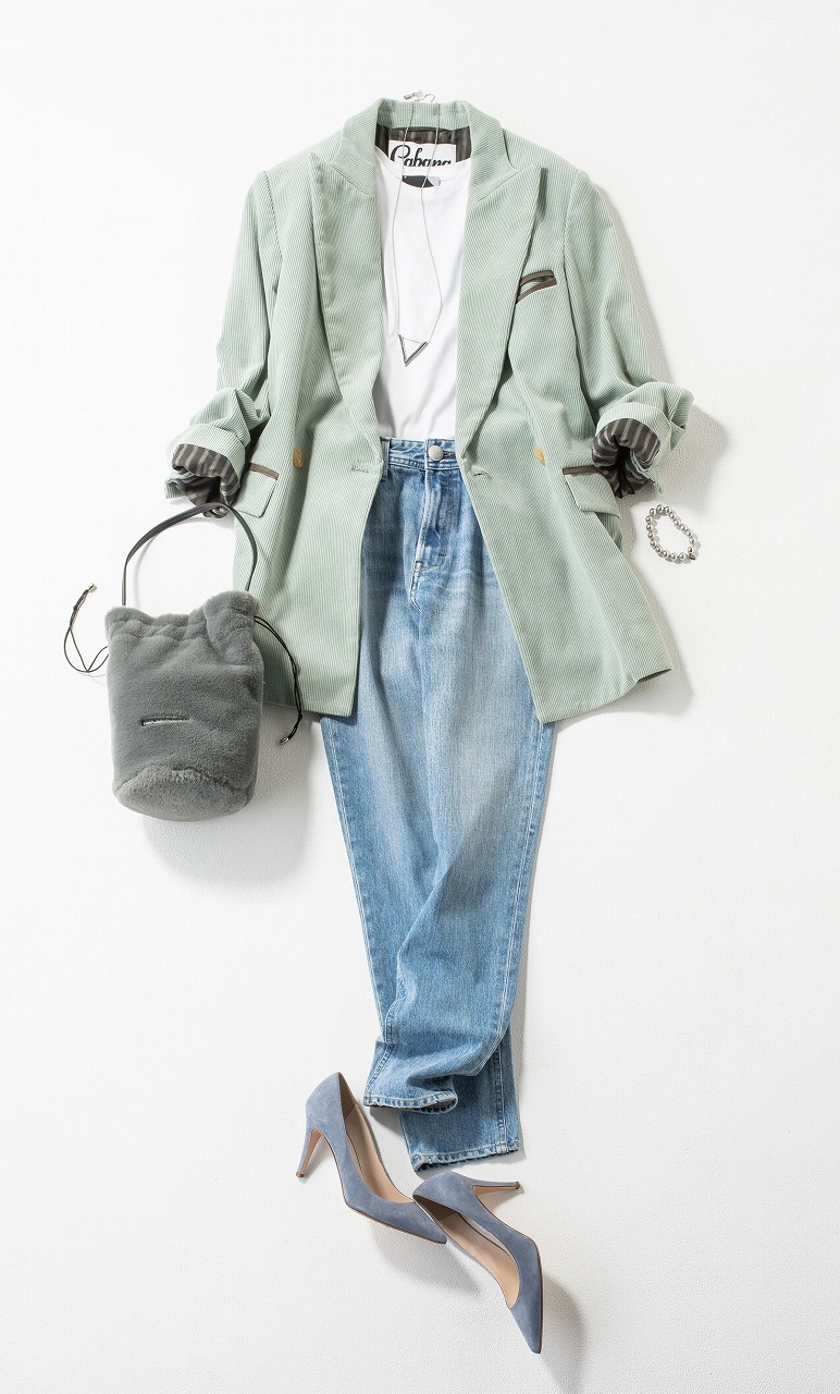 レングスは縦伸び、ウエストのみが横伸びするワザありストレッチデニム。太ももの肉を拾わず、まっすぐ伸びる脚をメイク。上半身を華奢に見せる、バサッと羽織れるジャケットでメリハリを。デニムパンツ¥25,000(ヤヌーク/カイタックインターナショナル)ミントグリーンコーデュロイジャケット¥79,000(カバナ/アマン)タンクトップ¥8,900(エイトン/エイトン青山)シルバーネックレス¥5,400パールブレスレット¥4,910(ともにアビステ)ファーバッグ¥9,000(ツル バイ マリコ オイカワ)パンプス¥44,000(ネブローニ/フラッパーズ)