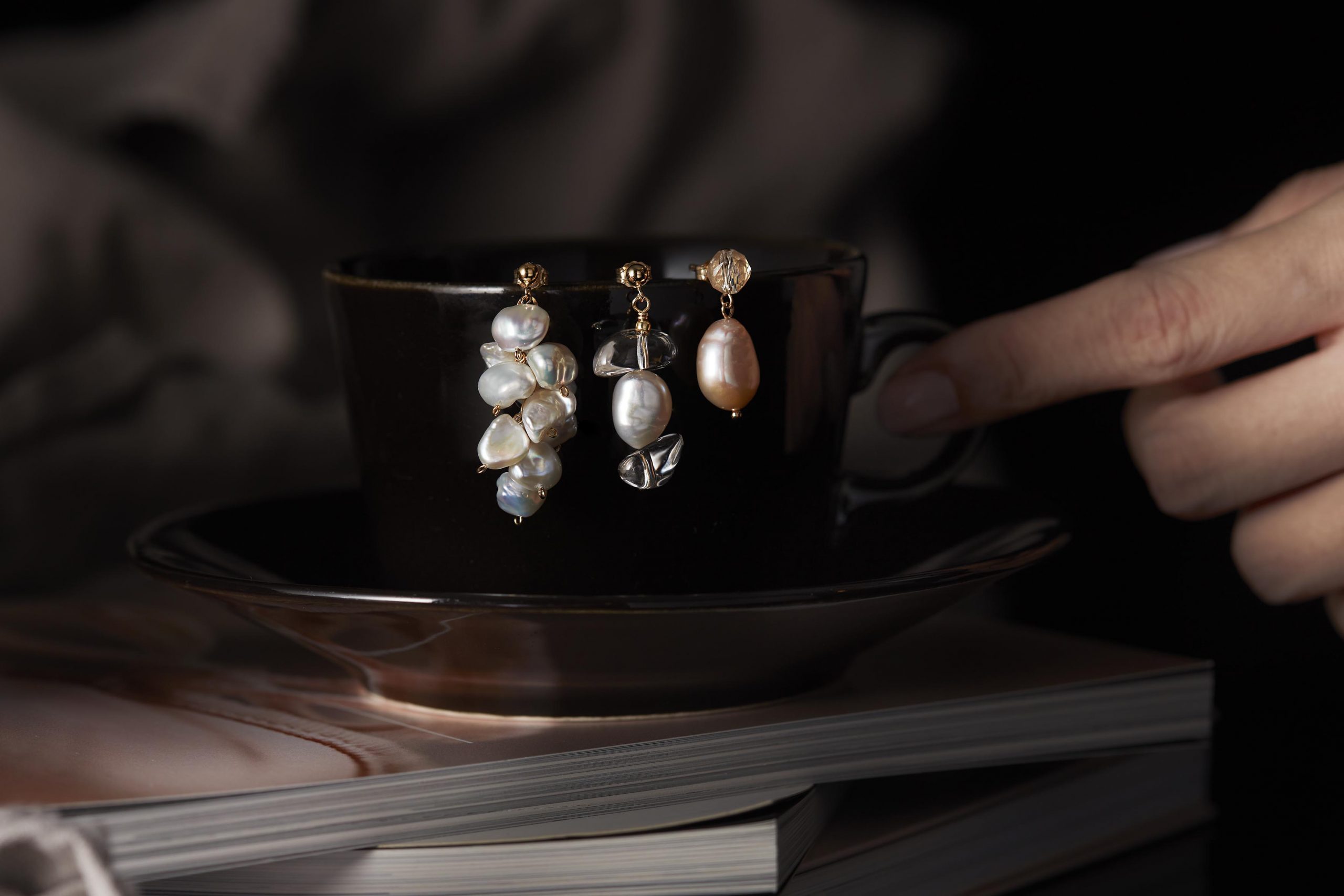 左から・変則的なシルエットが魅力のバロックパールが無数に散りばめられた贅沢なピアス。ピアス¥3,800バロックパールを、水晶で挟んだ神秘的なデザイン。ピアス¥3,500揺れるタイプのピアスも、小さめタイプならwithマスク生活に寄り添ってくれる。ピアス¥3,000(すべてUi.)