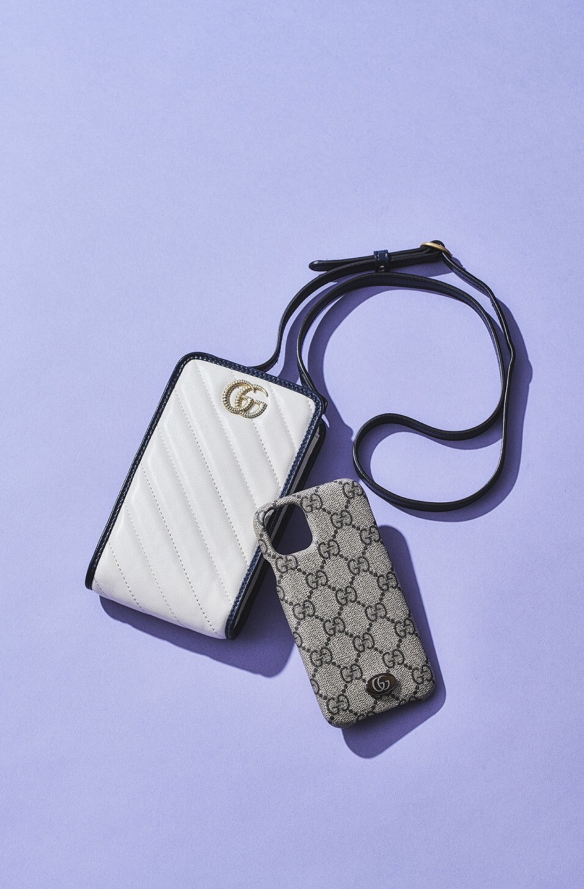 左/ぷっくりとしたキルティングレザー×ダブルGモチーフを配したラグジュアリーなスマホ用バッグ。スマートフォンケース「GGマーモント」<H19.5×W11.5×D3.5㎝>¥96,000 右/シックな存在感を放つ、GGパターンのキャンバス素材を使用。iPhoneケース<iPhone11対応>¥31,000(ともにグッチ/グッチ ジャパン)