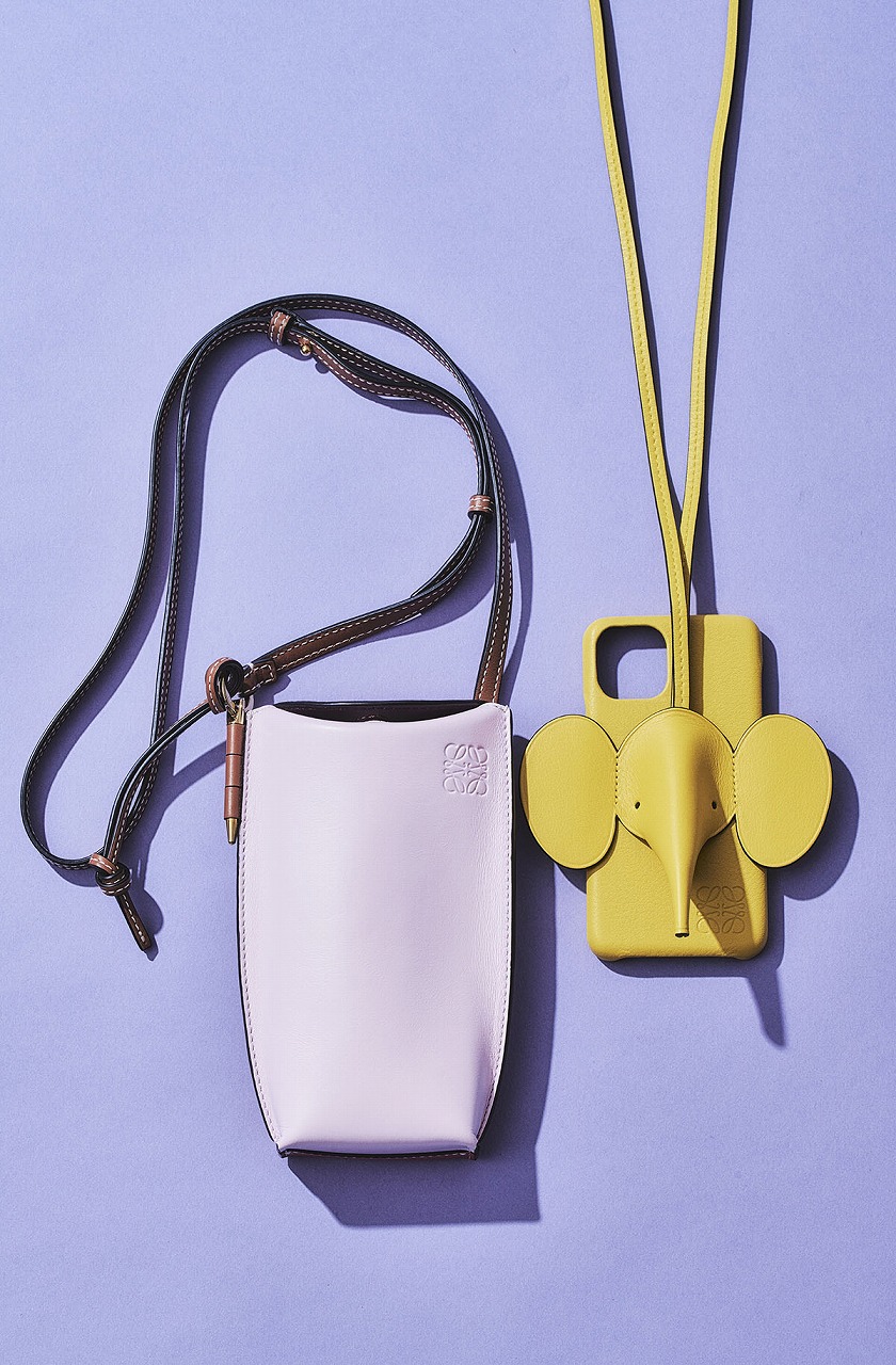 左/バイカラーのなめらかなレザーにうっとり。バッグ「ゲートポケット」<H19×W8×D4㎝>¥89,000 右/チャーミングな象が、見る人を笑顔にさせます。iPhoneカバー「エレファント フォンカバー」<iPhone11対応>¥60,000(ともにロエベ/ロエベ ジャパン クライアントサービス)