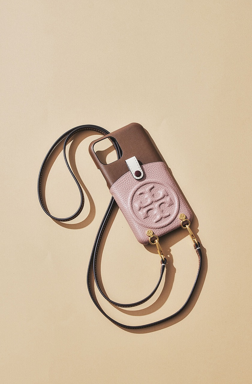 落ち着いたピンク×ブラウンのカラーリングで、秋冬の着こなしにもマッチ。iPhoneケース「Perry Bombe Phone Case Crossbody」<iPhone11 Pro対応>[ショルダーストラップ取り外し可能]¥18,000(トリー バーチ/トリー バーチ ジャパン)