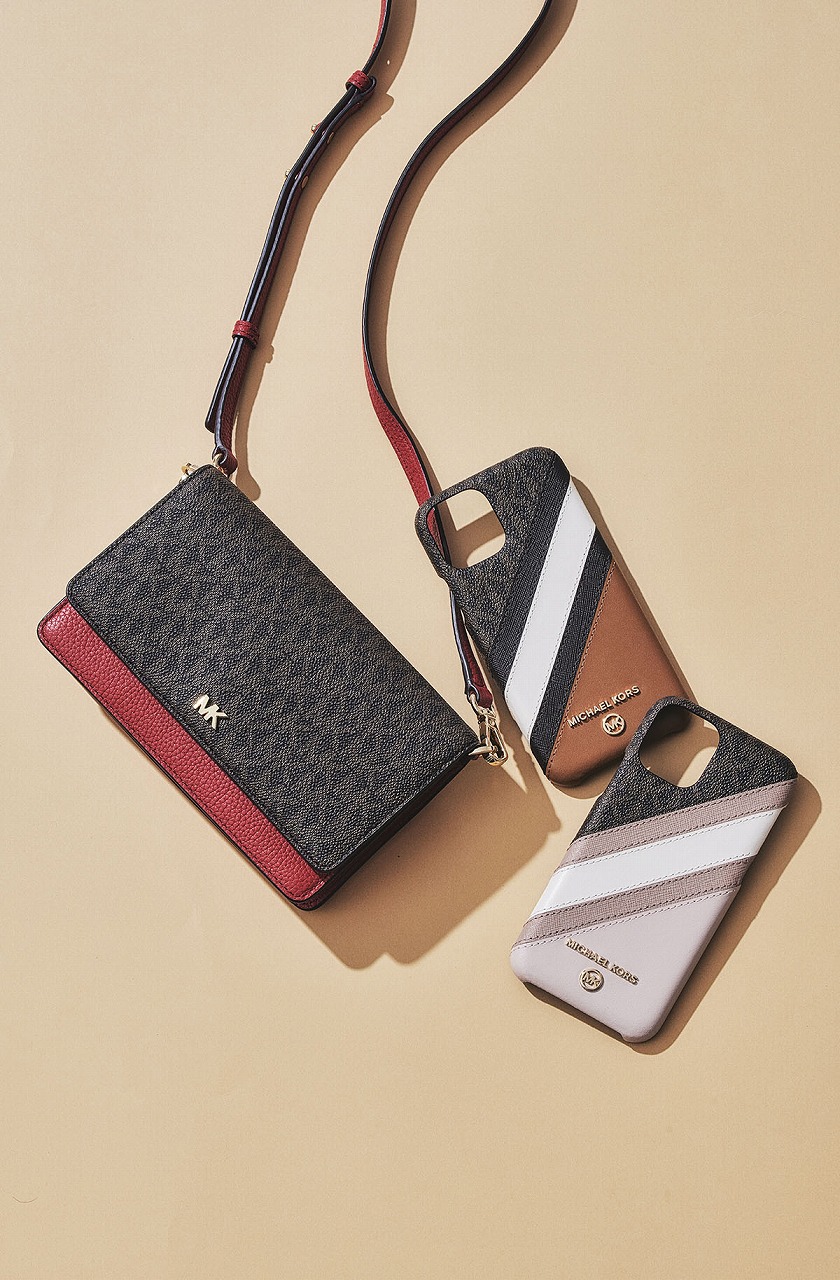 左/ちょっとしたお出かけにも対応可能なバッグ型。フォン クロスボディ「MOTT」<H11.5×W17.5×D2.5㎝>[ショルダーストラップ取り外し可能]¥24,000 中、右/MKシグネチャー×上品カラーの大人っぽいデザイン。スマートフォン ケース「ELECTRONIC NOVELTY」<iPhone11 Pro対応>各¥7,500(ともにマイケル マイケル・コース/マイケル・コース カスタマーサービス)