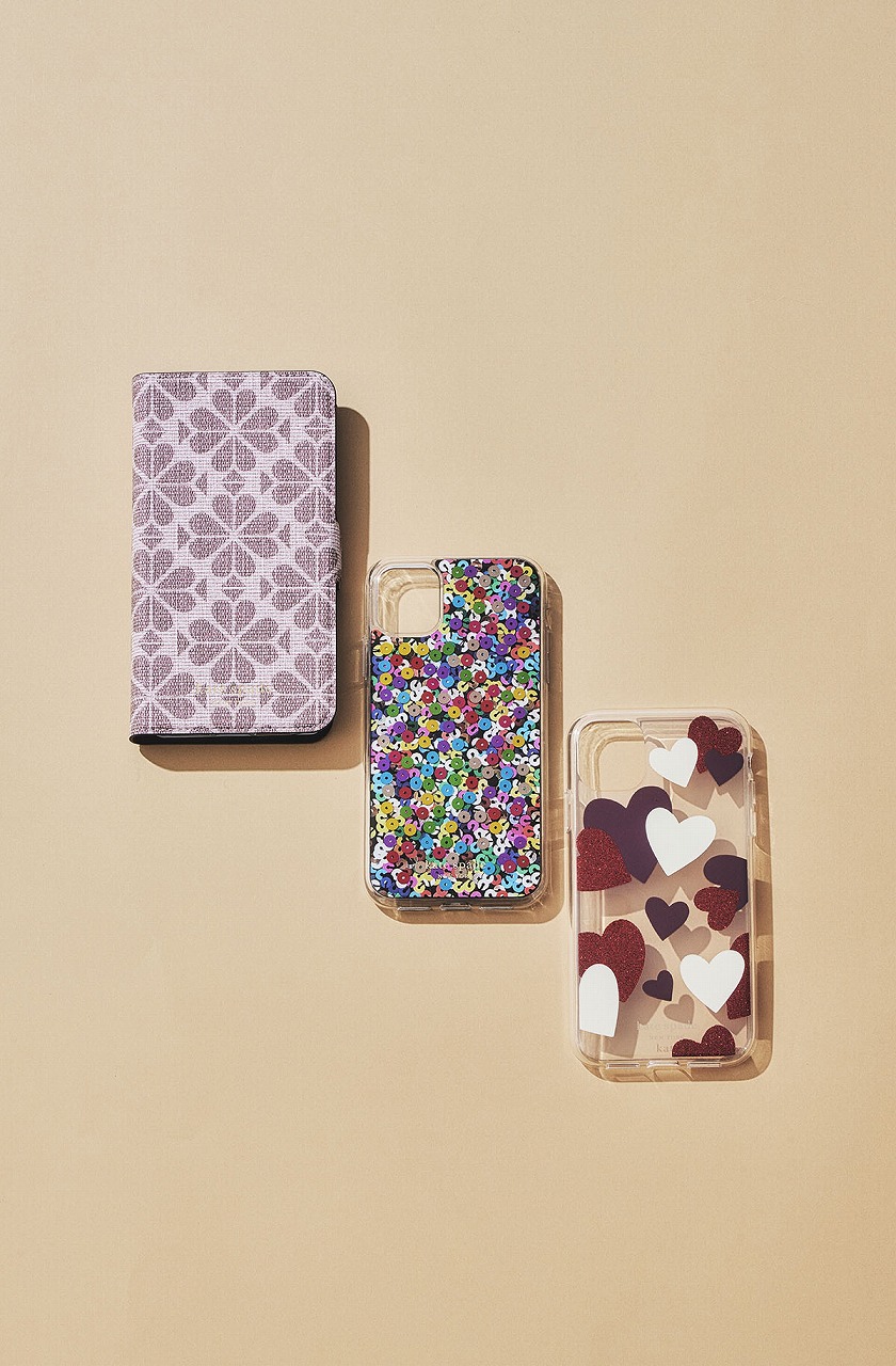 左/カードの収納ができるダイアリーケースタイプ。スペードフラワーiPhoneケース「SPADE FLOWER COATED CANVAS FOLIO 11」<iPhone11対応>¥11,000 中/動きに合わせて揺らめくスパンコールが視線をキャッチ。スパンコールiPhoneケース「SEQUINS PHONE CASE 11」<iPhone11対応>¥6,000 左/大人の乙女心を満たす、ビタースイートなハートにキュン♥ハートiPhoneケース「CELEBRATION HEARTS PHONE CASE 11」<iPhone11対応>¥4,500(すべてケイト・スペード ニューヨーク/ケイト・スペード カスタマーサービス)