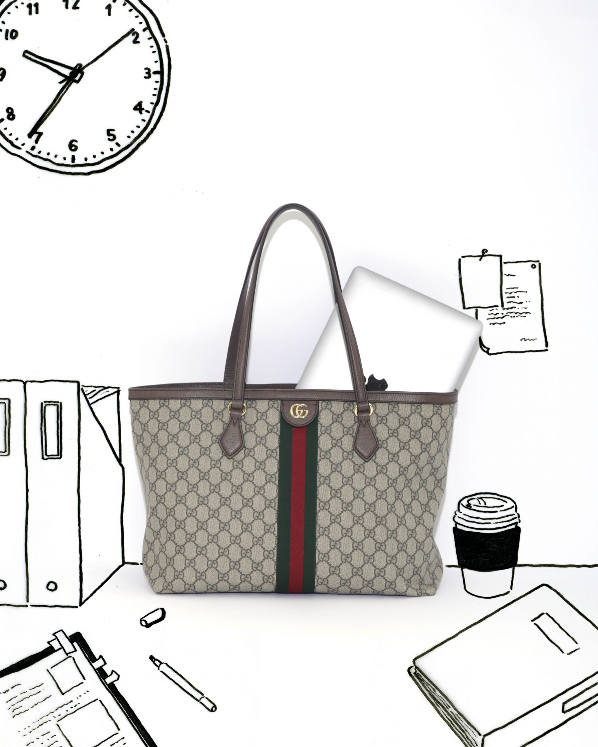 グッチのアイコンであるグリーン×レッドのウェブ ストライプが目を引くトート。大容量かつ軽量を追求する人にオススメ!バッグ「オフィディア」〈H28×W38×D14〉¥135,000(グッチ/グッチ ジャパン)