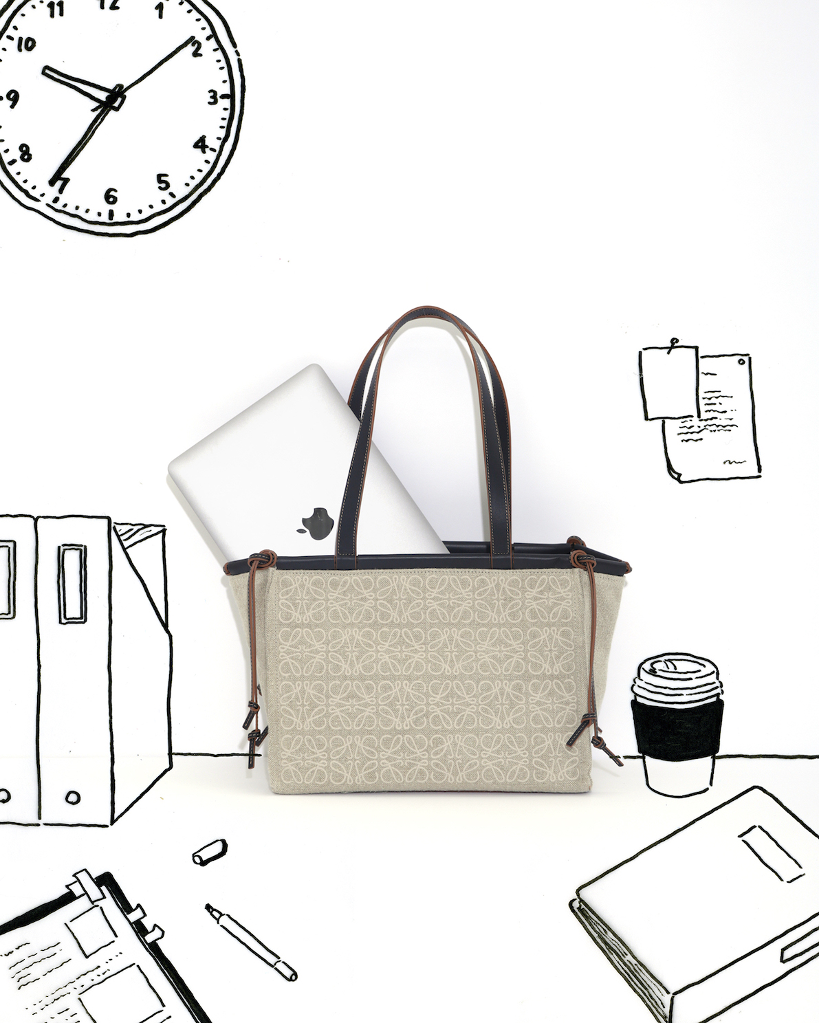 カーフスキンのトリミングがピリッと印象を引き締める。マチが広く、コンパクトながら収納力抜群。バッグ「クッション トート スモール アナグラムバッグ」〈H24×W32×D16〉¥179,000(ロエベ/ロエベ ジャパン クライアントサービス)