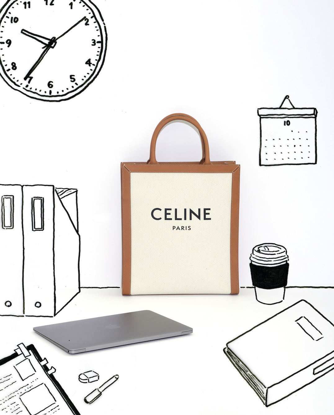 PCやタブレットがすっきり収まるサイズ感の薄型トートで仕事スタイルも今っぽくスマートに。バッグ「カバセリーヌ スモールヴァーティカル」〈H32×W29×D8〉¥155,000(セリーヌ バイ エディ・スリマン/セリーヌ ジャパン)