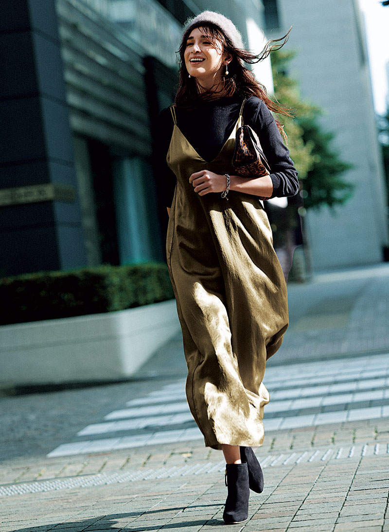 ツヤと華奢さを楽しむキャミワンピは今季のレイヤードスタイルに欠かせない!