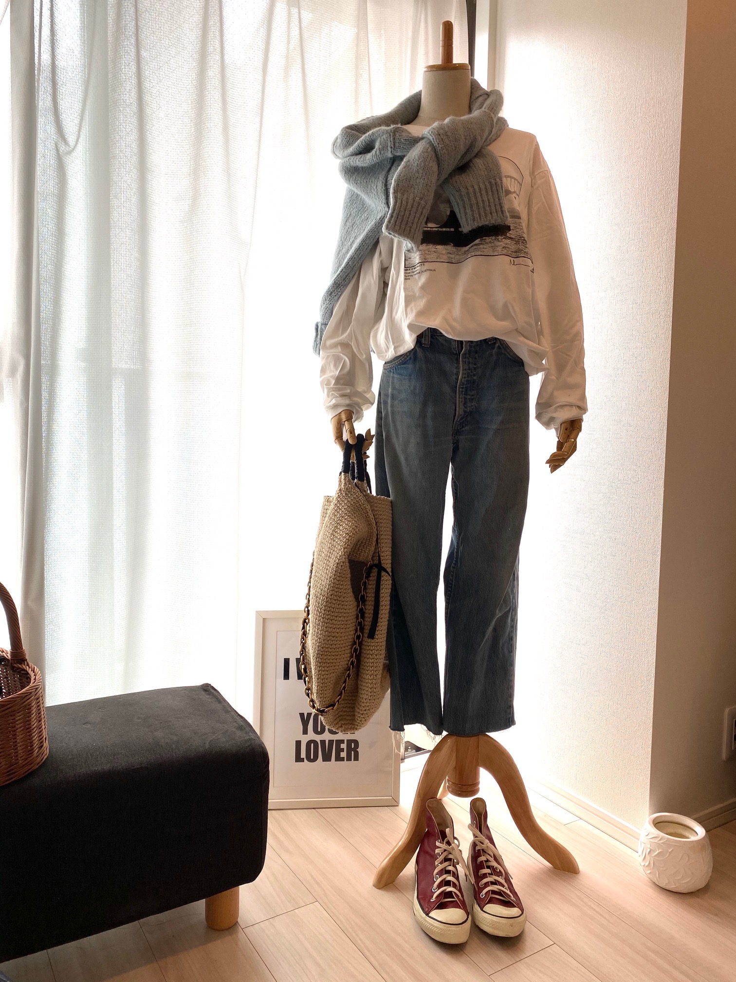 DENIM:LEVI’S、Tops:JANE SMITH、Knit:11AM、Bag:BEYOND THE REEF、Shoes:CONVERSE