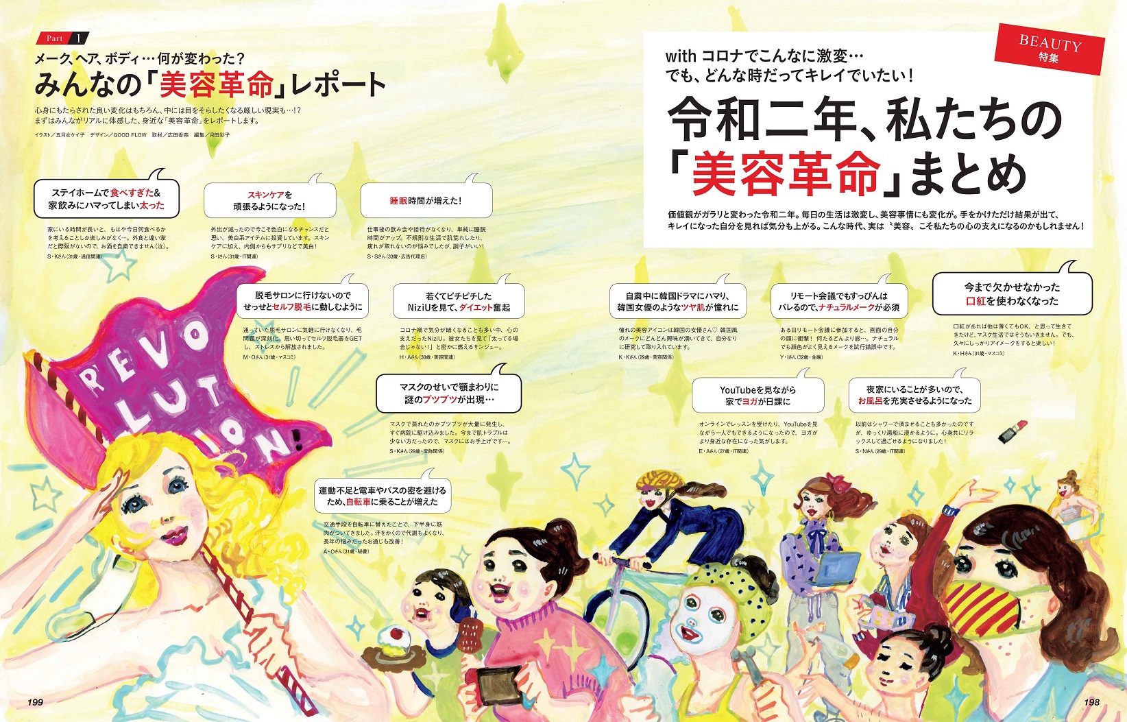 日々の暮らしは激変し、美容事情にも大きな変化が訪れた令和二年。12月号ということもあり、いったん振り返ってみました。「顔の下半分美容が主流」「マスク荒れを解決」「もっとおでこをキレイに!」などなど、いまの時代に必要な美容情報満載でお届けします。