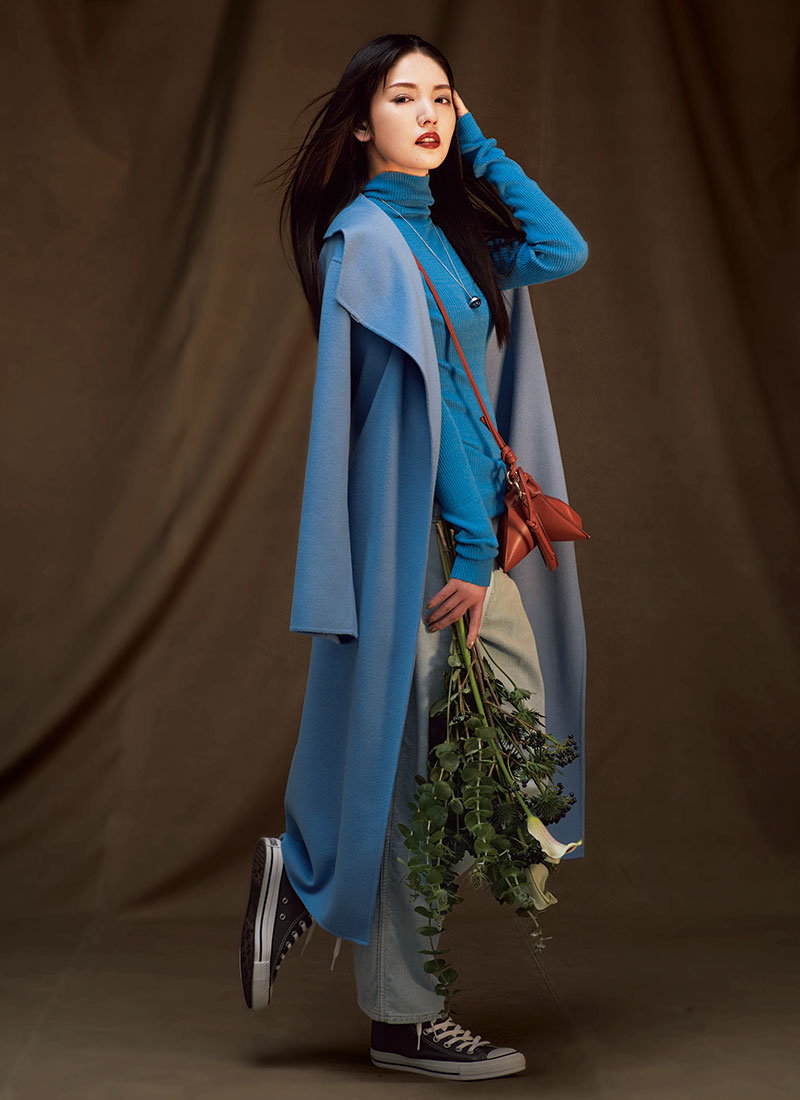 微妙にトーンの異なるブルーを重ねて奥行きのある上級者らしいワントーンに。コート¥39,000(CELFORD/CELFORD ルミネ新宿1店)ニット¥16,000(ソブ/フィルム)パンツ¥25,000(ウエストオーバーオールズ/フレームワーク ルミネ新宿店)バッグ¥57,000(ユゼフィ/TOMORROWLAND)スニーカー¥5,800(コ ンバース/コンバースインフォメーションセンター)ネックレス¥17,000(メラキ/フラッパーズ)
