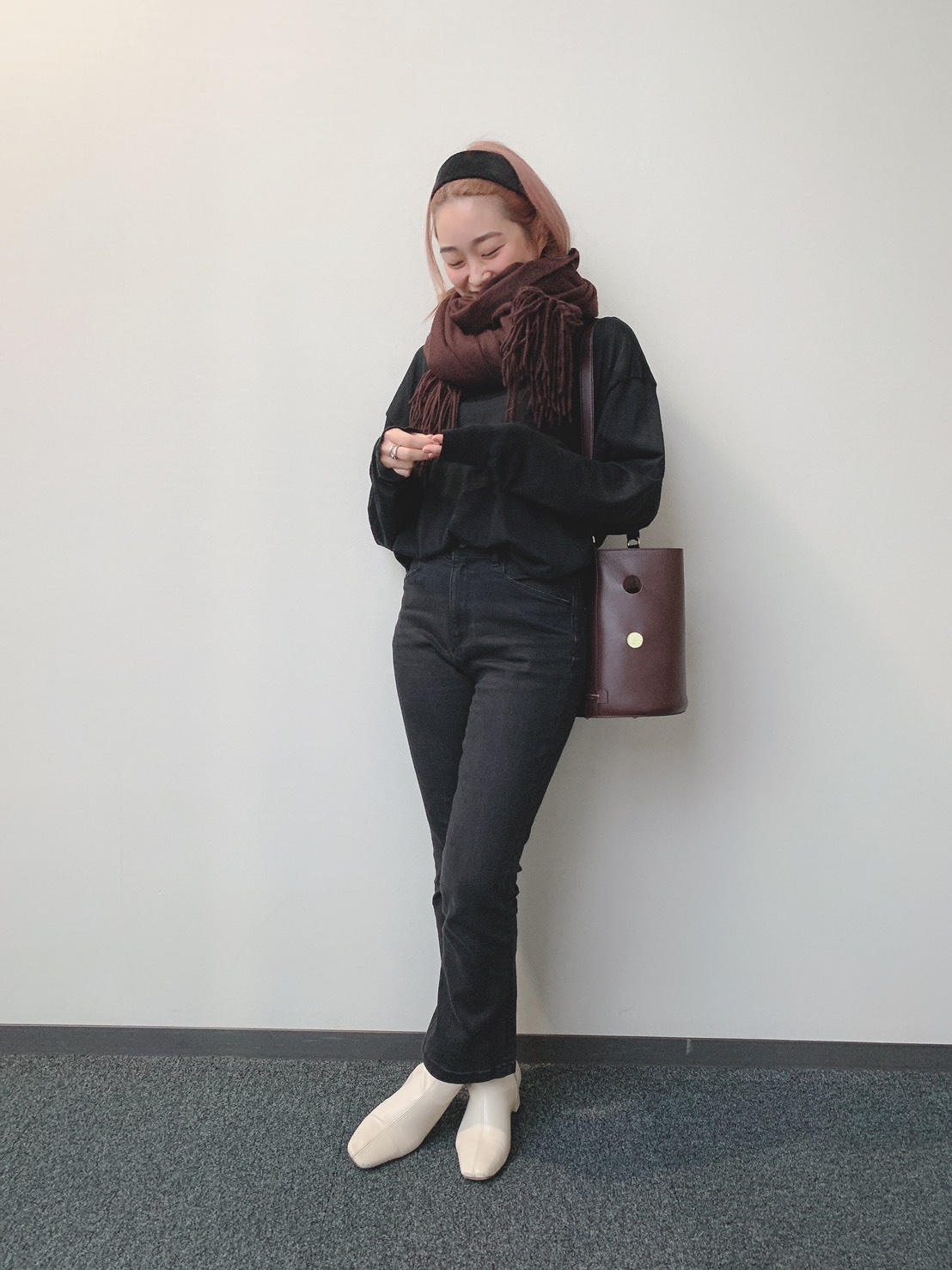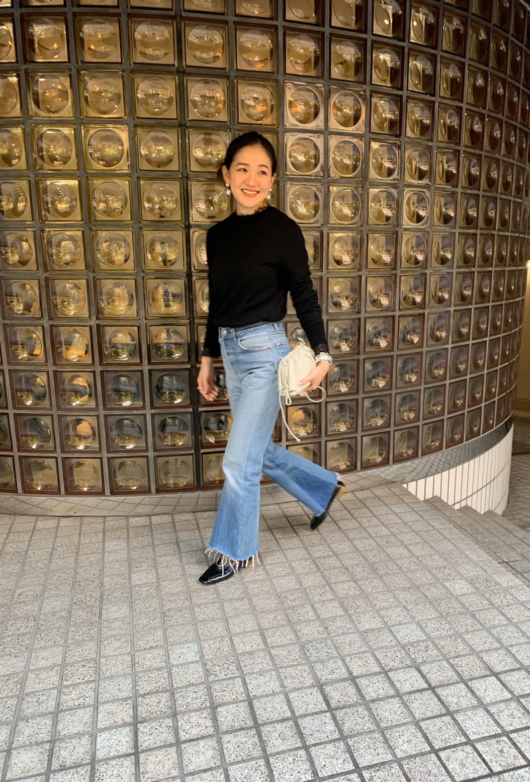 「髪をハイトーンにしてから黒のコーディネートが楽しくなり、ニット×デニムもオールブラックに挑戦!ATONのコットンニットはとにかく着心地が良く、the blackのデニムもとにかく柔らかくてお気に入りです。クロップド丈なのでSサイズの私でも裾をお直しせず穿けます。フレアデニムはシンプルなワンツーコーデも今っぽく見せてくれる気がします!」