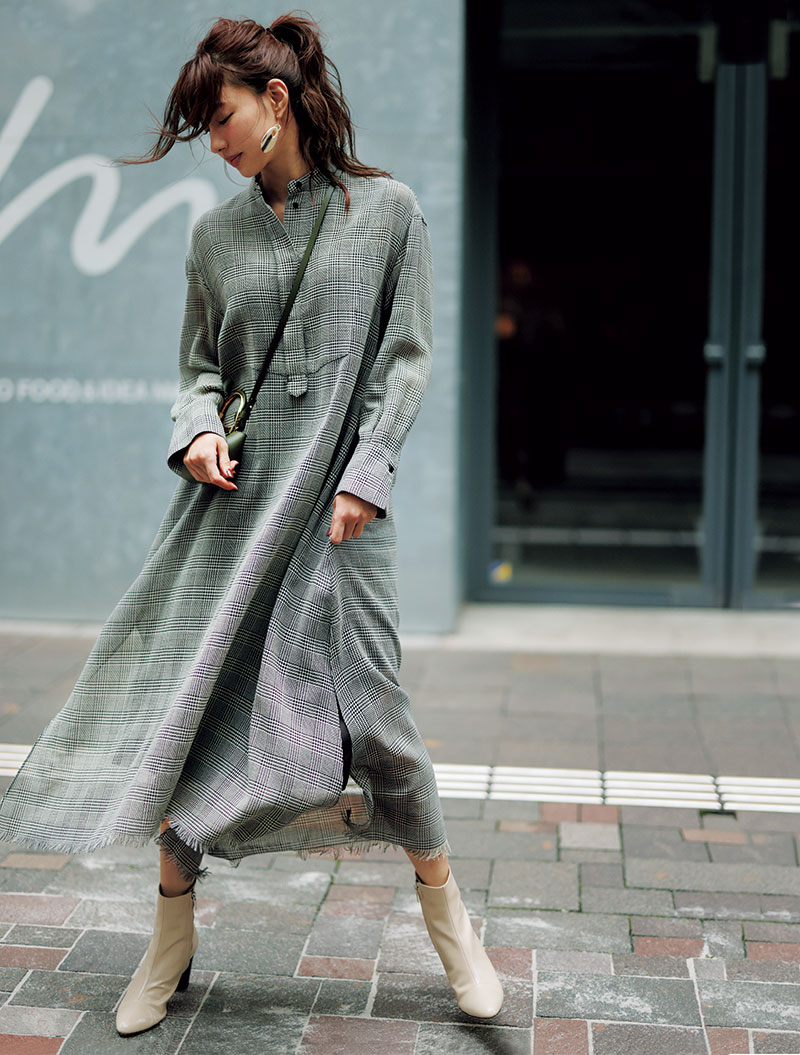 透け感のあるチェックのワンピは中に茶色のインナー付き。長袖のロング丈でも重さと無縁、シアー素材にスリット入りで裾にはフリンジ…、だからとっても軽やか!ワンピース¥53,000(ebure)バッグ¥90,000(ザンケッティ/八木通商ZANCHETTI事業部)ブーツ¥60,000(ロランス/ザ・グランドインク)イヤリング¥4,919(アビステ)