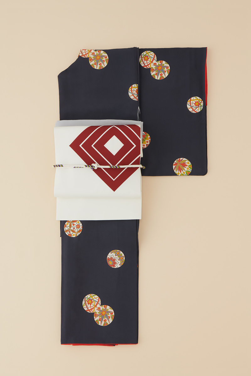 着物は金彩友禅、鉄御納戸色に手毬小紋。帯は「赤坂福田屋」さんの三枡です。これは市川海老蔵さんの十三代目・市川団十郎白猿襲名の「勧進帳」の舞台を楽しみに誂えた成田屋の紋、三枡の帯。深い藍色がかった鉄御納戸色に、金彩友禅染で手毬が描かれた小紋に合わせる予定。小紋というと飛び柄で無地場が多く、小さな柄物が多いですが、こんな風に昔ながらの大きな柄の詰まった小紋に合わせることで、より三枡の紋が引き立つように思います。
