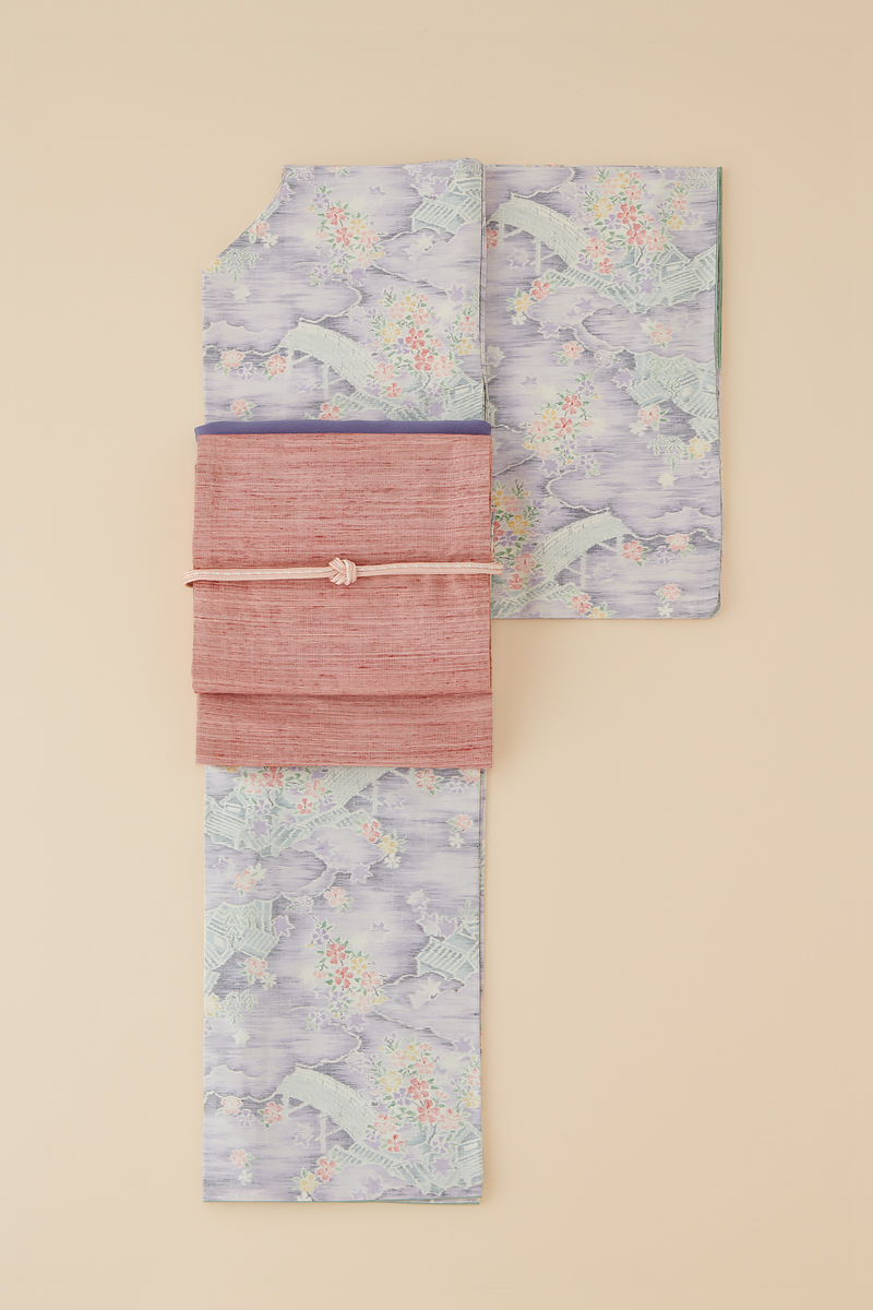 着物は御所解文様(桜紅葉)の小千谷紬。あくまで持論ですが、着物は全身を包むため、顔映りの良い色と柄を選べばスッキリ着られると思います。そして総柄を着ることも、洋服では得られない着物ならではの楽しみ。ピンクからパープルの甘い色合わせは優しい雰囲気に魅せてくれるので、食事会など華やかな席に来て行きたいです。