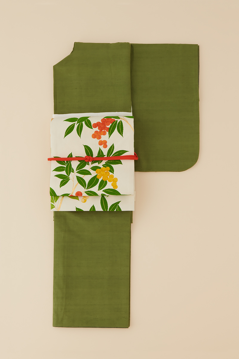 「池田重子さんの色」と記されていた鶯。まだ渋いかな、と思っていましたが、着込むほどに羽毛が取れ肌に馴染む、経年劣化も結城紬の魅力と知り、一刻も早く着たくなりました。色調が強く、大胆な植物柄の織りの帯であれば、今の私でも楽しめると思ってます。主張のある帯をシンプルな着物に締めるスタイルは、いつも以上に着付けにも気を配り、小物も崩しすぎず品よくまとめたいです。