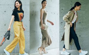 英国ブランド、バーバリーのトレンチを主役に。ピンクのパイビングが効いた遊び心のあるデザインで、かぶりやすいトレンチスタイルをアップデート。たくさん歩く街だから厚底ソールのスニーカーを。