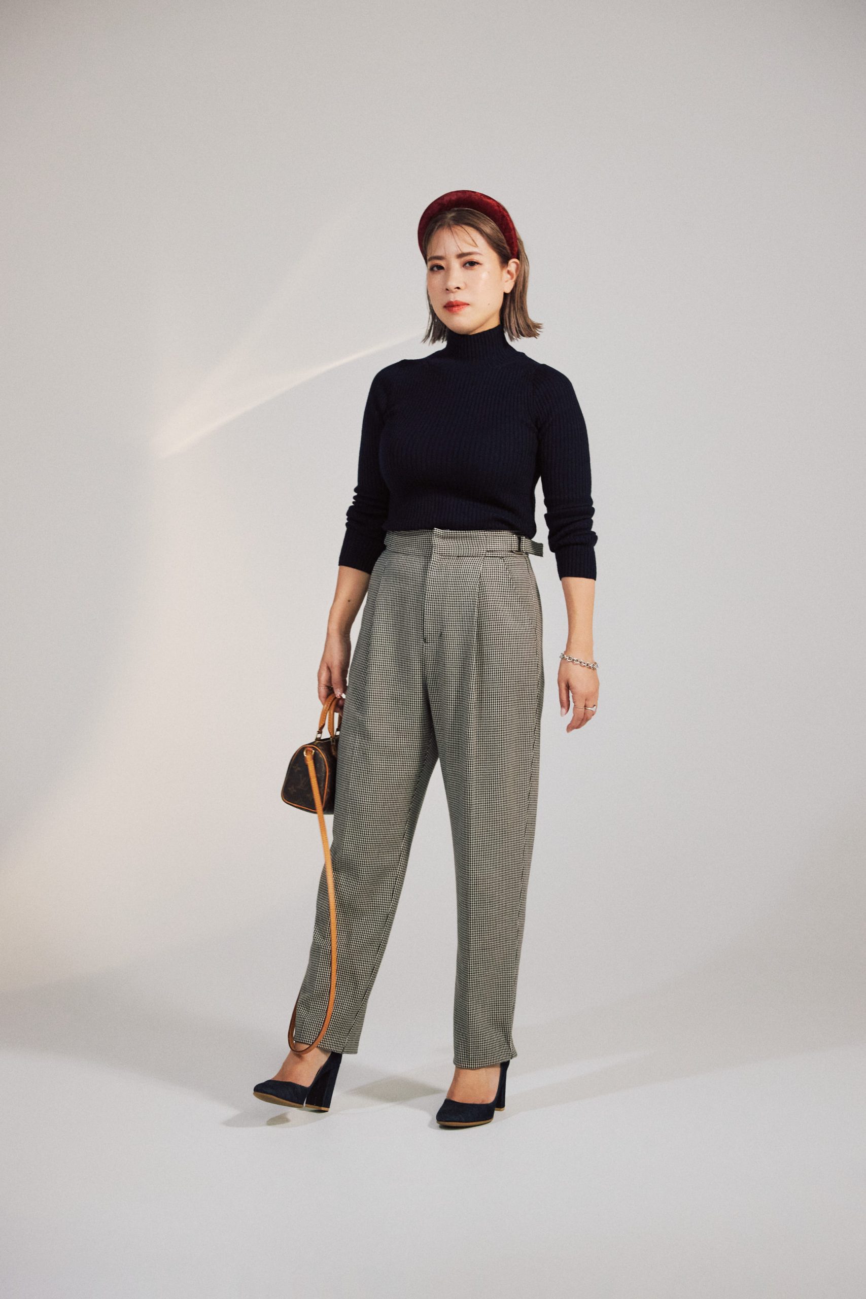 「ハイウエストでサイドにベルトがあるチェックパンツは、腰位置が高く見えて優秀。シンプルなタートルネックニットをインするだけで、スタイルアップが叶います」(児嶋さん)