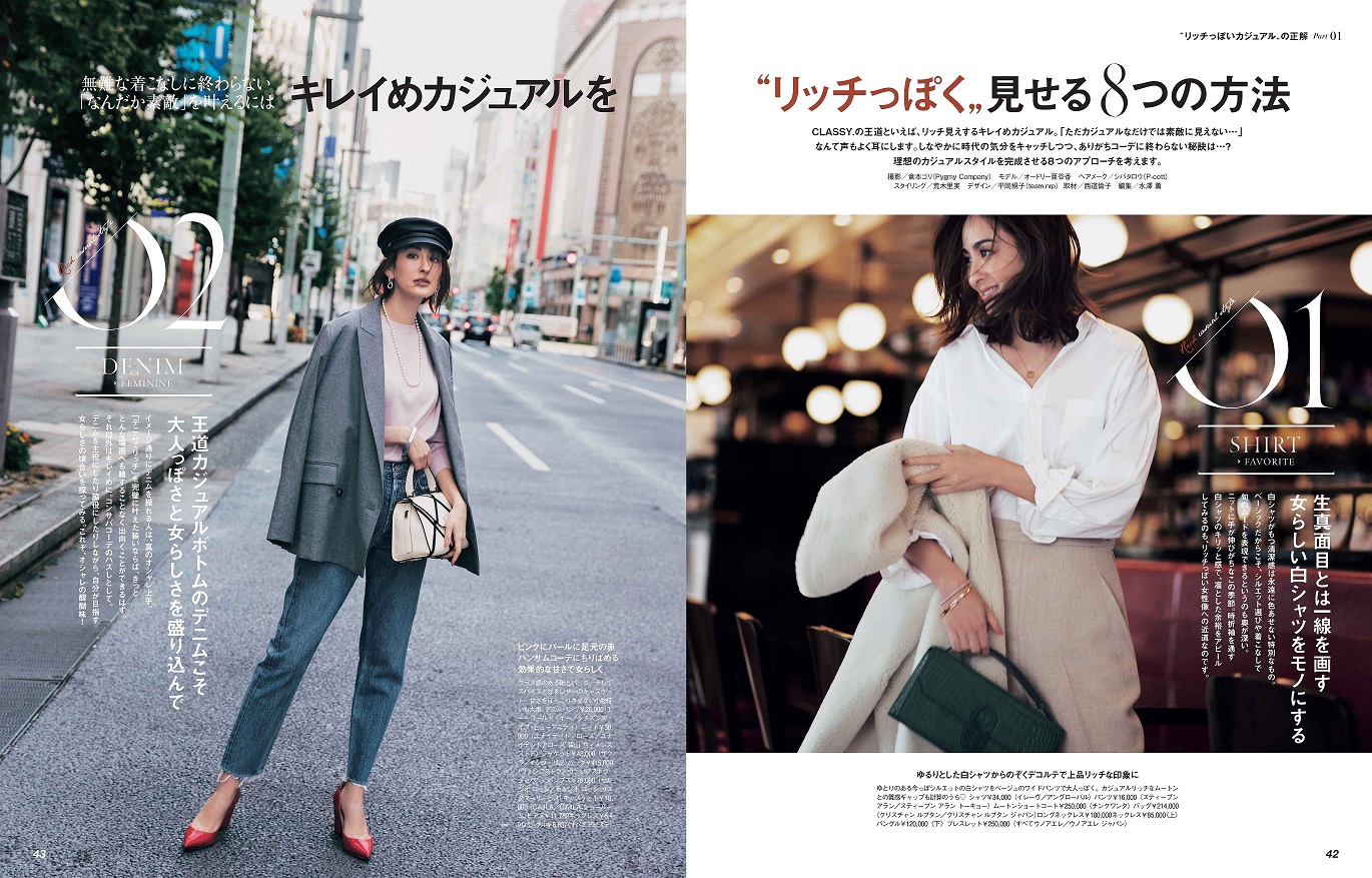 CLASSY.の王道であるシンプルでキレイめなカジュアルは、ともすれば“無難で普通”な着こなしになってしまいがち。そこでこのパートでは、「あの人、シンプルなのになんだか素敵」と思われちゃうような、絶対に“リッチ見え”する8つの着こなしルールをご紹介します。