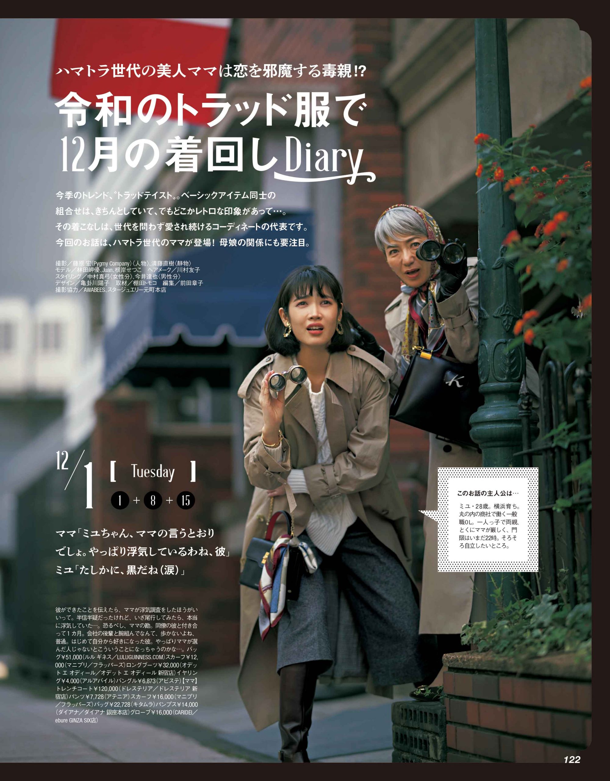 人気の着回し企画、今月のテーマは秋冬になると恋しくなる「トラッド」です。そして今回の物語は、商社OLである主人公の“ママ”が物語の鍵を握っています。恋にもオシャレにも、事あるごとに口を挟んでくる“ハマトラ世代”のママの描写、とても楽しく香ばしく仕上がってますので、ぜひご覧ください!