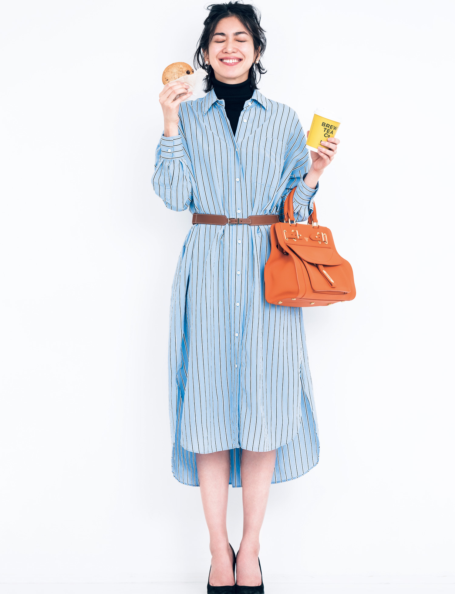 一枚ではもちろん羽織りにも。両サイドのスリットがモテ要素! シャツワンピース¥34,000(エストネーション) -