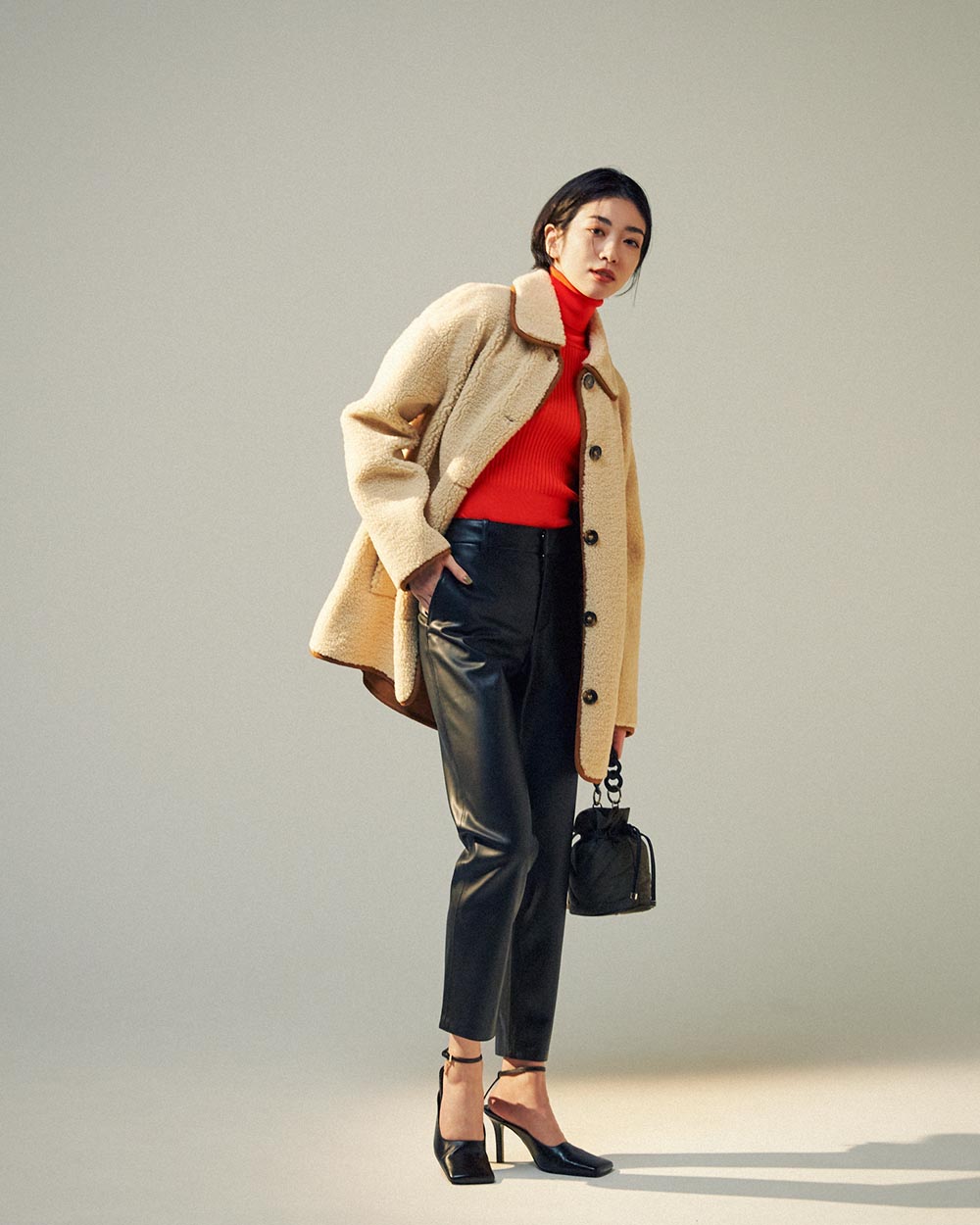 足首にかけてスッと落ちる美脚クロップド。シルエットが美しいので王道のタートルニット合わせでもカッコよく決まります。いつもの黒デニムをたまにエコレザーに変えるのが、この冬のお約束。パンツ¥5,990ジャケット¥10,990ニット¥3,590バッグ¥4,990パンプス¥11,900(すべてザラ/ザラ カスタマーサービス)