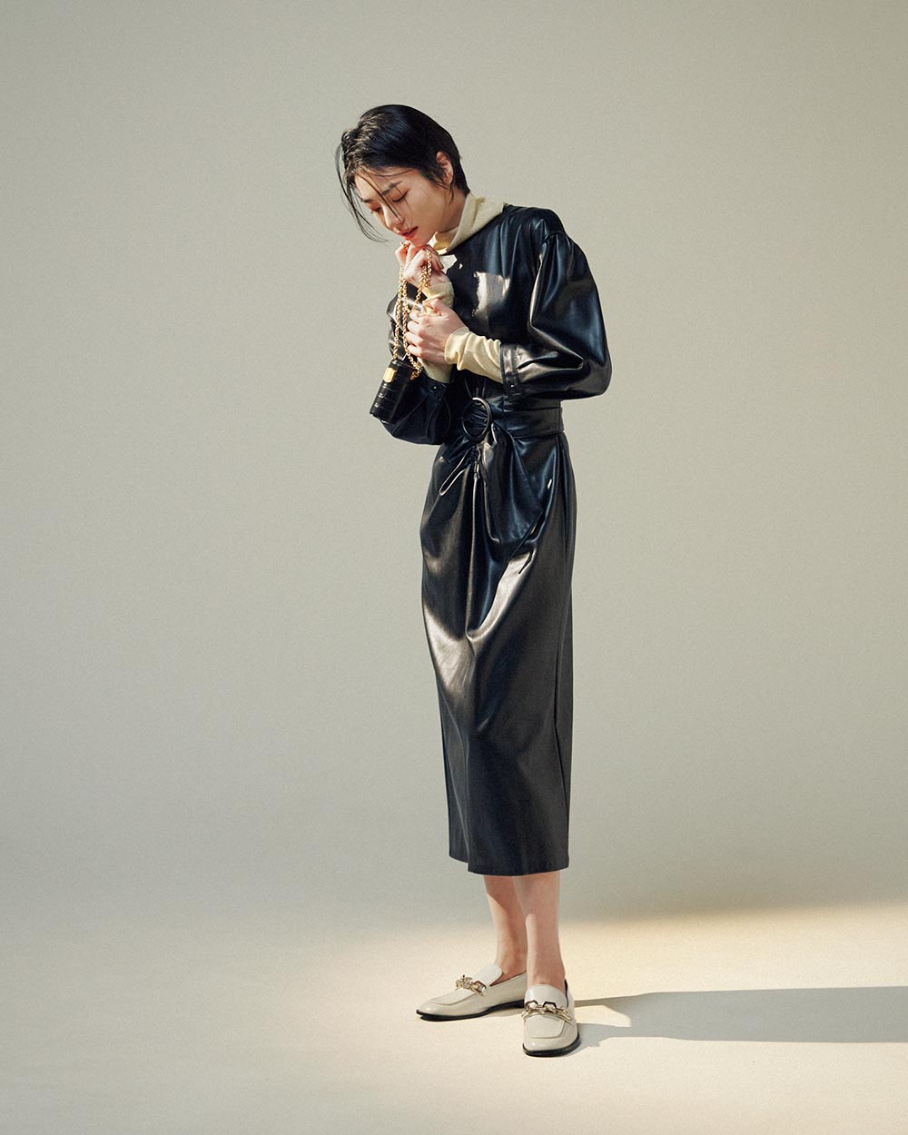 モードなレザー調ワンピースを気負いなく着るなら? 首や袖元からニットをのぞかせてラフさをプラス!難しく感じるレイヤードも、黒×アイボリーの2色配色ならTRYしやすそう。ワンピース¥6,990ニット¥4,990バッグ¥2,590ローファー¥5,990(すべてザラ/ザラ カスタマーサービス)