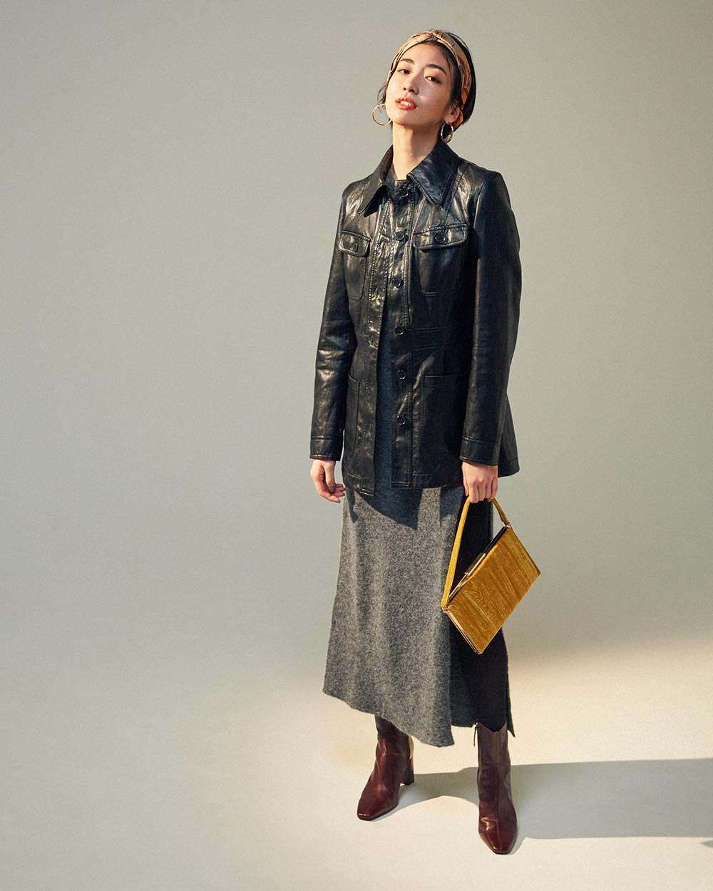冬のオシャレに欠かせない楽ちんニットワンピース。いつもの着こなしをハンサムに仕上げるなら、ヴィンテージ風のエコレザーがハンサムでいい塩梅。ジャケット¥8,990ワンピース¥8,990バッグ¥5,990ブーツ¥13,990スカーフ¥1,990ピアス¥1,990(すべてザラ/ザラ カスタマーサービス)