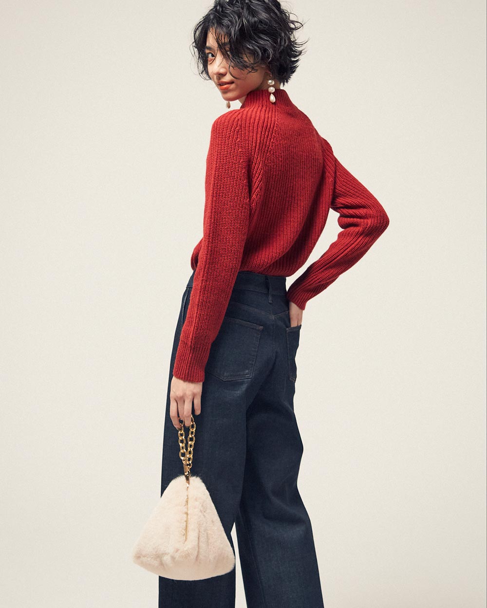 デイリー使いが最適です。ラグランスリーブデザインと、少しゆるっとしたシルエット。360°どこから見ても、大人の余裕を感じさせる佇まいに。ニット¥5,446デニムパンツ¥3,628(ともに無印良品/無印良品 銀座)バッグ¥3,900(burself)ピアス¥8,500(ジェンマ アルス)