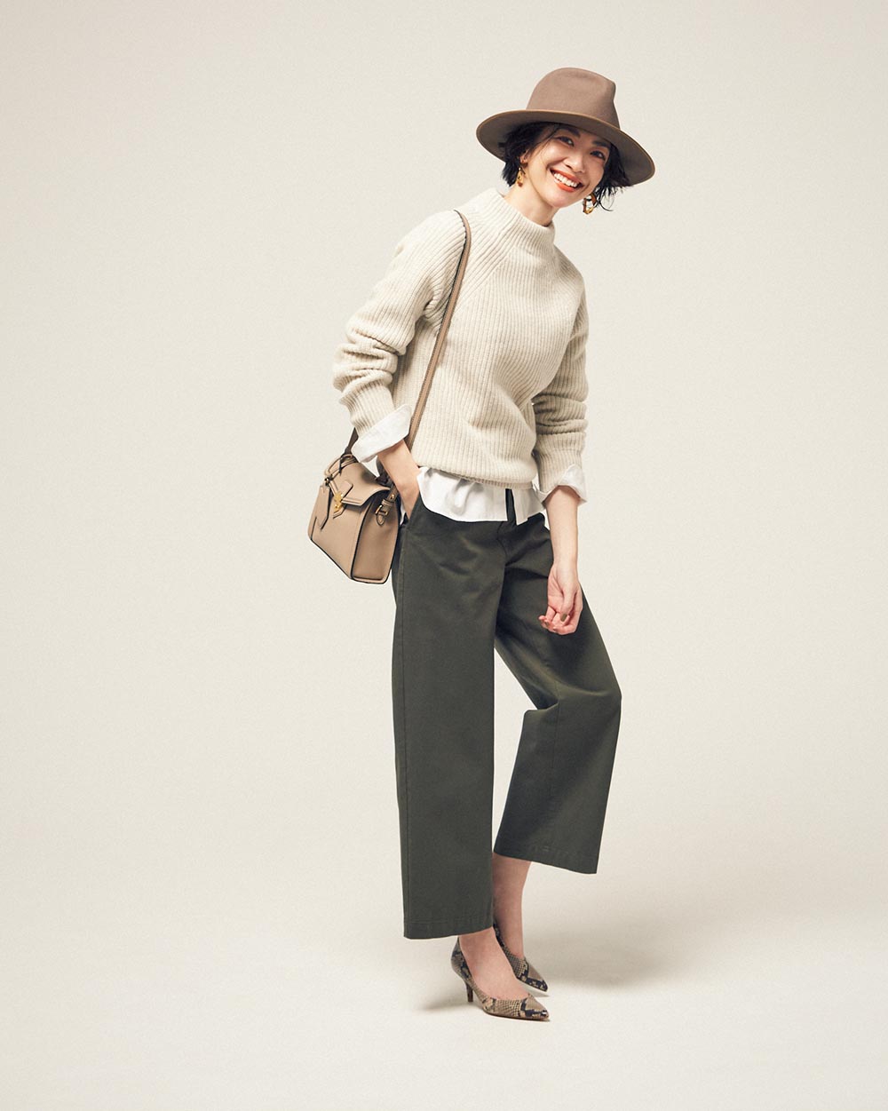 肌を美しく見せる、淡いシルバーグレー。リュクスな色だから、INに重ねたシャツでラフさをトッピング。ニット¥5,446シャツ¥2,719パンツ¥2,719(すべて無印良品/無印良品 銀座)バッグ¥190,909(スマイソン)パンプス¥30,000(モード エ ジャコモ/ロコンド)帽子¥17,600(CA4LA/CA4LA プレスルーム)ピアス¥10,920(ソコ/ZUTTOHOLIC)